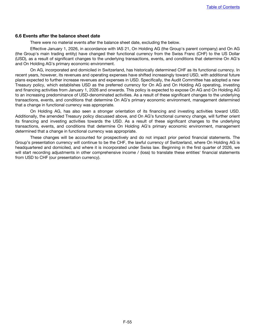 6.6 Events after the balance sheet date There were no material events after the balance sheet date, excluding the below. Effective January 1, 2026, in accordance with IAS 21, On Holding AG (the Group's parent company) and On AG (the Group's main trading entity) have changed their functional currency from the Swiss Franc (CHF) to the US Dollar (USD), as a result of significant changes to the underlying transactions, events, and conditions that determine On AG's and On Holding AG's primary economic environment. On AG, incorporated and domiciled in Switzerland, has historically determined CHF as its functional currency. In recent years, however, its revenues and operating expenses have shifted increasingly toward USD, with additional future plans expected to further increase revenues and expenses in USD. Specifically, the Audit Committee has adopted a new Treasury policy, which establishes USD as the preferred currency for On AG and On Holding AG operating, investing and financing activities from January 1, 2026 and onwards. This policy is expected to expose On AG and On Holding AG to an increasing predominance of USD-denominated activities. As a result of these significant changes to the underlying transactions, events, and conditions that determine On AG's primary economic environment, management determined that a change in functional currency was appropriate. On Holding AG, has also seen a stronger orientation of its financing and investing activities toward USD. Additionally, the amended Treasury policy discussed above, and On AG’s functional currency change, will further orient its financing and investing activities towards the USD. As a result of these significant changes to the underlying transactions, events, and conditions that determine On Holding AG's primary economic environment, management determined that a change in functional currency was appropriate. These changes will be accounted for prospectively and do not impact prior period financial statements. The Group’s presentation currency will continue to be the CHF, the lawful currency of Switzerland, where On Holding AG is headquartered and domiciled, and where it is incorporated under Swiss law. Beginning in the first quarter of 2026, we will start recording adjustments in other comprehensive income / (loss) to translate these entities' financial statements from USD to CHF (our presentation currency). Table of Contents F-55