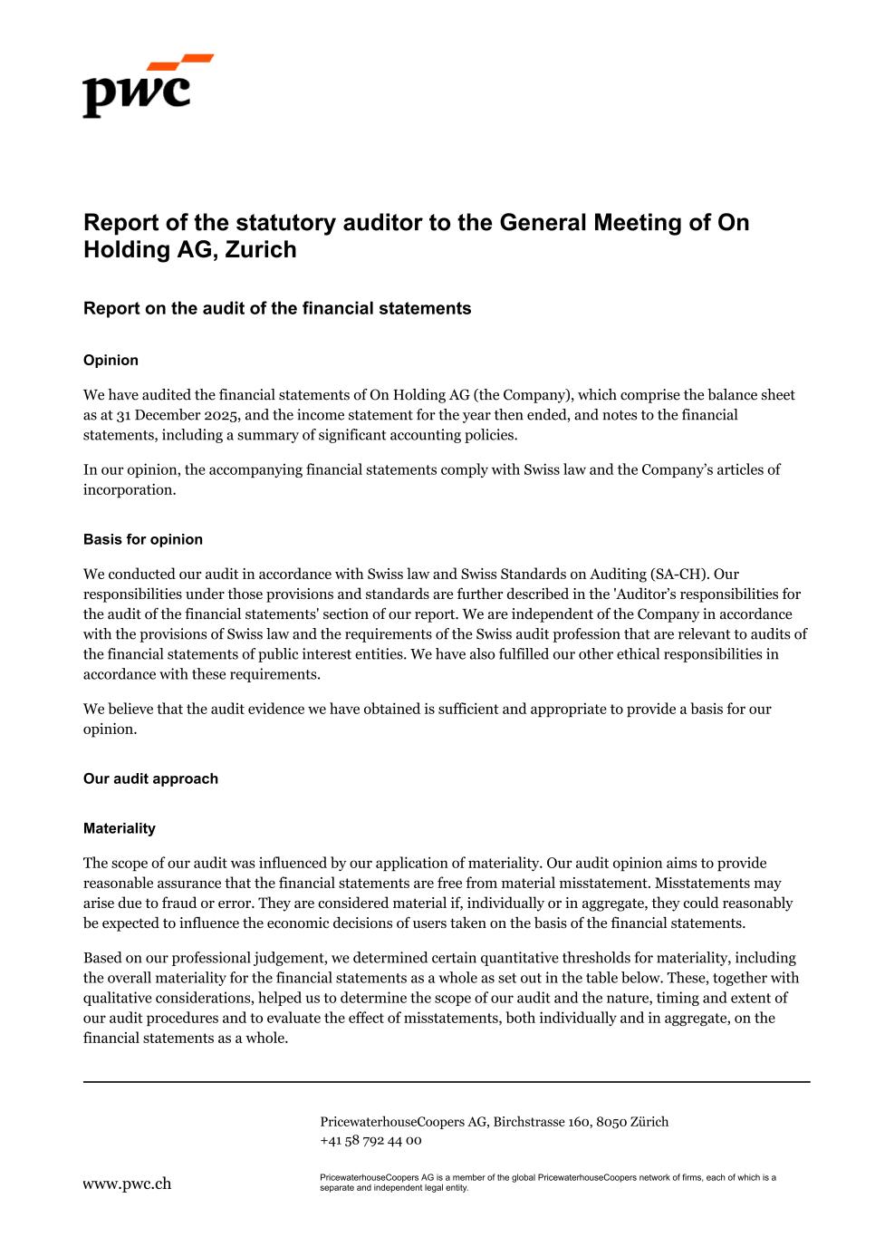 Report of the statutory auditor to the General Meeting of On Holding AG, Zurich Report on the audit of the financial statements Opinion We have audited the financial statements of On Holding AG (the Company), which comprise the balance sheet as at 31 December 2025, and the income statement for the year then ended, and notes to the financial statements, including a summary of significant accounting policies. In our opinion, the accompanying financial statements comply with Swiss law and the Company’s articles of incorporation. Basis for opinion We conducted our audit in accordance with Swiss law and Swiss Standards on Auditing (SA-CH). Our responsibilities under those provisions and standards are further described in the 'Auditor’s responsibilities for the audit of the financial statements' section of our report. We are independent of the Company in accordance with the provisions of Swiss law and the requirements of the Swiss audit profession that are relevant to audits of the financial statements of public interest entities. We have also fulfilled our other ethical responsibilities in accordance with these requirements. We believe that the audit evidence we have obtained is sufficient and appropriate to provide a basis for our opinion. Our audit approach Materiality The scope of our audit was influenced by our application of materiality. Our audit opinion aims to provide reasonable assurance that the financial statements are free from material misstatement. Misstatements may arise due to fraud or error. They are considered material if, individually or in aggregate, they could reasonably be expected to influence the economic decisions of users taken on the basis of the financial statements. Based on our professional judgement, we determined certain quantitative thresholds for materiality, including the overall materiality for the financial statements as a whole as set out in the table below. These, together with qualitative considerations, helped us to determine the scope of our audit and the nature, timing and extent of our audit procedures and to evaluate the effect of misstatements, both individually and in aggregate, on the financial statements as a whole. PricewaterhouseCoopers AG, Birchstrasse 160, 8050 Zürich +41 58 792 44 00 www.pwc.ch PricewaterhouseCoopers AG is a member of the global PricewaterhouseCoopers network of firms, each of which is a separate and independent legal entity.