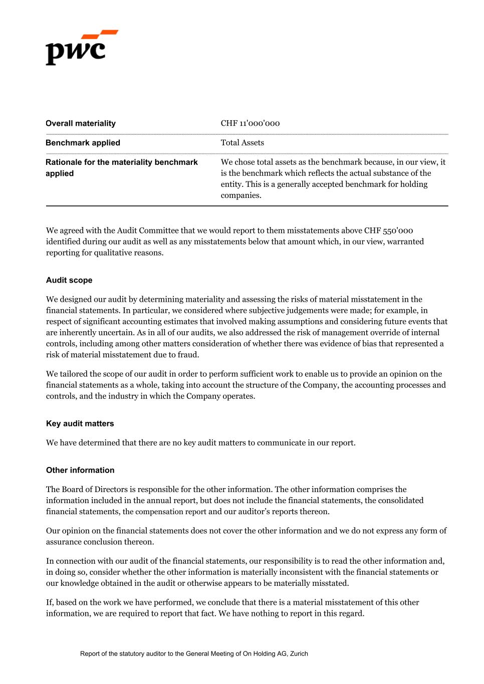 Overall materiality CHF 11'000'000 Benchmark applied Total Assets Rationale for the materiality benchmark applied We chose total assets as the benchmark because, in our view, it is the benchmark which reflects the actual substance of the entity. This is a generally accepted benchmark for holding companies. We agreed with the Audit Committee that we would report to them misstatements above CHF 550'000 identified during our audit as well as any misstatements below that amount which, in our view, warranted reporting for qualitative reasons. Audit scope We designed our audit by determining materiality and assessing the risks of material misstatement in the financial statements. In particular, we considered where subjective judgements were made; for example, in respect of significant accounting estimates that involved making assumptions and considering future events that are inherently uncertain. As in all of our audits, we also addressed the risk of management override of internal controls, including among other matters consideration of whether there was evidence of bias that represented a risk of material misstatement due to fraud. We tailored the scope of our audit in order to perform sufficient work to enable us to provide an opinion on the financial statements as a whole, taking into account the structure of the Company, the accounting processes and controls, and the industry in which the Company operates. Key audit matters We have determined that there are no key audit matters to communicate in our report. Other information The Board of Directors is responsible for the other information. The other information comprises the information included in the annual report, but does not include the financial statements, the consolidated financial statements, the compensation report and our auditor’s reports thereon. Our opinion on the financial statements does not cover the other information and we do not express any form of assurance conclusion thereon. In connection with our audit of the financial statements, our responsibility is to read the other information and, in doing so, consider whether the other information is materially inconsistent with the financial statements or our knowledge obtained in the audit or otherwise appears to be materially misstated. If, based on the work we have performed, we conclude that there is a material misstatement of this other information, we are required to report that fact. We have nothing to report in this regard. Report of the statutory auditor to the General Meeting of On Holding AG, Zurich