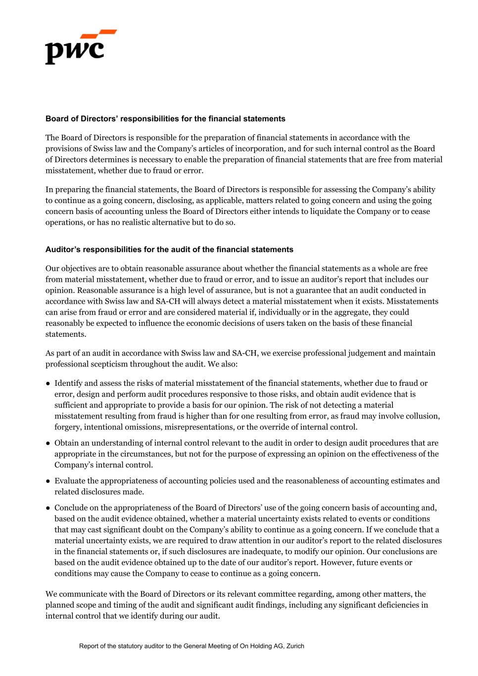 Board of Directors’ responsibilities for the financial statements The Board of Directors is responsible for the preparation of financial statements in accordance with the provisions of Swiss law and the Company’s articles of incorporation, and for such internal control as the Board of Directors determines is necessary to enable the preparation of financial statements that are free from material misstatement, whether due to fraud or error. In preparing the financial statements, the Board of Directors is responsible for assessing the Company’s ability to continue as a going concern, disclosing, as applicable, matters related to going concern and using the going concern basis of accounting unless the Board of Directors either intends to liquidate the Company or to cease operations, or has no realistic alternative but to do so. Auditor’s responsibilities for the audit of the financial statements Our objectives are to obtain reasonable assurance about whether the financial statements as a whole are free from material misstatement, whether due to fraud or error, and to issue an auditor’s report that includes our opinion. Reasonable assurance is a high level of assurance, but is not a guarantee that an audit conducted in accordance with Swiss law and SA-CH will always detect a material misstatement when it exists. Misstatements can arise from fraud or error and are considered material if, individually or in the aggregate, they could reasonably be expected to influence the economic decisions of users taken on the basis of these financial statements. As part of an audit in accordance with Swiss law and SA-CH, we exercise professional judgement and maintain professional scepticism throughout the audit. We also: ● Identify and assess the risks of material misstatement of the financial statements, whether due to fraud or error, design and perform audit procedures responsive to those risks, and obtain audit evidence that is sufficient and appropriate to provide a basis for our opinion. The risk of not detecting a material misstatement resulting from fraud is higher than for one resulting from error, as fraud may involve collusion, forgery, intentional omissions, misrepresentations, or the override of internal control. ● Obtain an understanding of internal control relevant to the audit in order to design audit procedures that are appropriate in the circumstances, but not for the purpose of expressing an opinion on the effectiveness of the Company’s internal control. ● Evaluate the appropriateness of accounting policies used and the reasonableness of accounting estimates and related disclosures made. ● Conclude on the appropriateness of the Board of Directors’ use of the going concern basis of accounting and, based on the audit evidence obtained, whether a material uncertainty exists related to events or conditions that may cast significant doubt on the Company’s ability to continue as a going concern. If we conclude that a material uncertainty exists, we are required to draw attention in our auditor’s report to the related disclosures in the financial statements or, if such disclosures are inadequate, to modify our opinion. Our conclusions are based on the audit evidence obtained up to the date of our auditor’s report. However, future events or conditions may cause the Company to cease to continue as a going concern. We communicate with the Board of Directors or its relevant committee regarding, among other matters, the planned scope and timing of the audit and significant audit findings, including any significant deficiencies in internal control that we identify during our audit. Report of the statutory auditor to the General Meeting of On Holding AG, Zurich