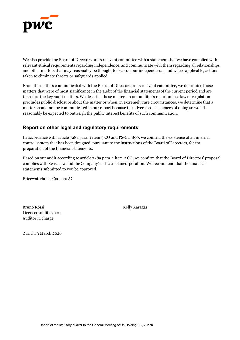 We also provide the Board of Directors or its relevant committee with a statement that we have complied with relevant ethical requirements regarding independence, and communicate with them regarding all relationships and other matters that may reasonably be thought to bear on our independence, and where applicable, actions taken to eliminate threats or safeguards applied. From the matters communicated with the Board of Directors or its relevant committee, we determine those matters that were of most significance in the audit of the financial statements of the current period and are therefore the key audit matters. We describe these matters in our auditor’s report unless law or regulation precludes public disclosure about the matter or when, in extremely rare circumstances, we determine that a matter should not be communicated in our report because the adverse consequences of doing so would reasonably be expected to outweigh the public interest benefits of such communication. Report on other legal and regulatory requirements In accordance with article 728a para. 1 item 3 CO and PS-CH 890, we confirm the existence of an internal control system that has been designed, pursuant to the instructions of the Board of Directors, for the preparation of the financial statements. Based on our audit according to article 728a para. 1 item 2 CO, we confirm that the Board of Directors' proposal complies with Swiss law and the Company’s articles of incorporation. We recommend that the financial statements submitted to you be approved. PricewaterhouseCoopers AG Bruno Rossi Kelly Karagas Licensed audit expert Auditor in charge Zürich, 3 March 2026 Report of the statutory auditor to the General Meeting of On Holding AG, Zurich