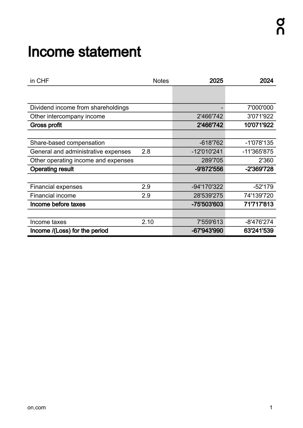 Income statement in CHF Notes 2025 2024 Dividend income from shareholdings - 7'000'000 Other intercompany income 2'466'742 3'071'922 Gross profit 2'466'742 10'071'922 Share-based compensation -618'762 -1'078'135 General and administrative expenses 2.8 -12'010'241 -11'365'875 Other operating income and expenses 289'705 2'360 Operating result -9'872'556 -2'369'728 Financial expenses 2.9 -94'170'322 -52'179 Financial income 2.9 28'539'275 74'139'720 Income before taxes -75'503'603 71'717'813 Income taxes 2.10 7'559'613 -8'476'274 Income /(Loss) for the period -67'943'990 63'241'539 on.com 1