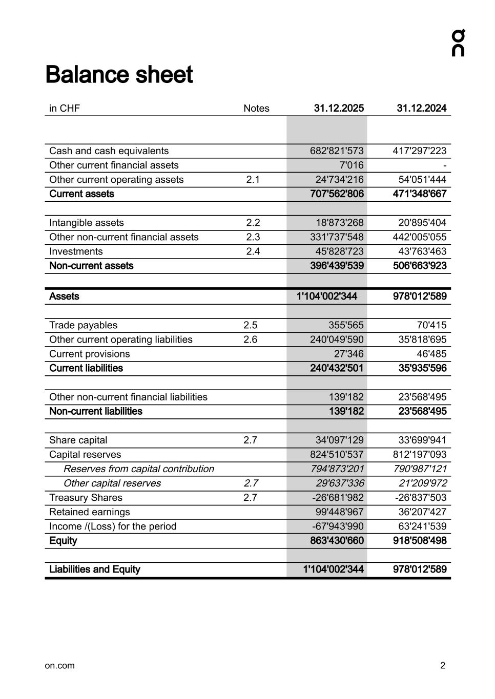 Balance sheet in CHF Notes 31.12.2025 31.12.2024 Cash and cash equivalents 682'821'573 417'297'223 Other current financial assets 7'016 - Other current operating assets 2.1 24'734'216 54'051'444 Current assets 707'562'806 471'348'667 Intangible assets 2.2 18'873'268 20'895'404 Other non-current financial assets 2.3 331'737'548 442'005'055 Investments 2.4 45'828'723 43'763'463 Non-current assets 396'439'539 506'663'923 Assets 1'104'002'344 978'012'589 Trade payables 2.5 355'565 70'415 Other current operating liabilities 2.6 240'049'590 35'818'695 Current provisions 27'346 46'485 Current liabilities 240'432'501 35'935'596 Other non-current financial liabilities 139'182 23'568'495 Non-current liabilities 139'182 23'568'495 Share capital 2.7 34'097'129 33'699'941 Capital reserves 824'510'537 812'197'093 Reserves from capital contribution 794'873'201 790'987'121 Other capital reserves 2.7 29'637'336 21'209'972 Treasury Shares 2.7 -26'681'982 -26'837'503 Retained earnings 99'448'967 36'207'427 Income /(Loss) for the period -67'943'990 63'241'539 Equity 863'430'660 918'508'498 Liabilities and Equity 1'104'002'344 978'012'589 on.com 2
