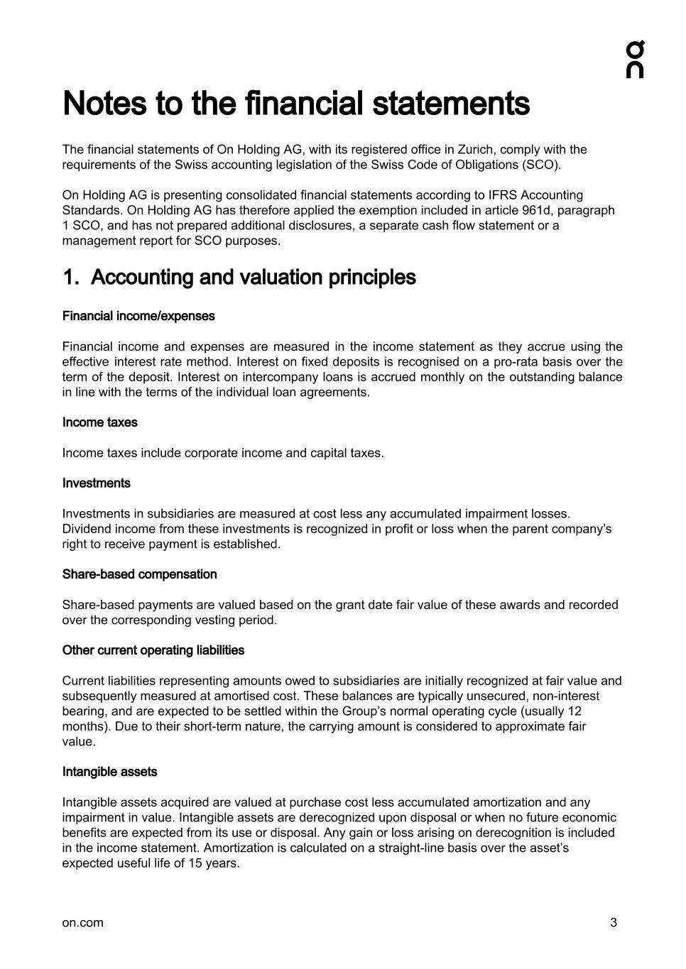 Notes to the financial statements The financial statements of On Holding AG, with its registered office in Zurich, comply with the requirements of the Swiss accounting legislation of the Swiss Code of Obligations (SCO). On Holding AG is presenting consolidated financial statements according to IFRS Accounting Standards. On Holding AG has therefore applied the exemption included in article 961d, paragraph 1 SCO, and has not prepared additional disclosures, a separate cash flow statement or a management report for SCO purposes. 1. Accounting and valuation principles Financial income/expenses Financial income and expenses are measured in the income statement as they accrue using the effective interest rate method. Interest on fixed deposits is recognised on a pro-rata basis over the term of the deposit. Interest on intercompany loans is accrued monthly on the outstanding balance in line with the terms of the individual loan agreements. Income taxes Income taxes include corporate income and capital taxes. Investments Investments in subsidiaries are measured at cost less any accumulated impairment losses. Dividend income from these investments is recognized in profit or loss when the parent company’s right to receive payment is established. Share-based compensation Share-based payments are valued based on the grant date fair value of these awards and recorded over the corresponding vesting period. Other current operating liabilities Current liabilities representing amounts owed to subsidiaries are initially recognized at fair value and subsequently measured at amortised cost. These balances are typically unsecured, non-interest bearing, and are expected to be settled within the Group’s normal operating cycle (usually 12 months). Due to their short-term nature, the carrying amount is considered to approximate fair value. Intangible assets Intangible assets acquired are valued at purchase cost less accumulated amortization and any impairment in value. Intangible assets are derecognized upon disposal or when no future economic benefits are expected from its use or disposal. Any gain or loss arising on derecognition is included in the income statement. Amortization is calculated on a straight-line basis over the asset’s expected useful life of 15 years. on.com 3
