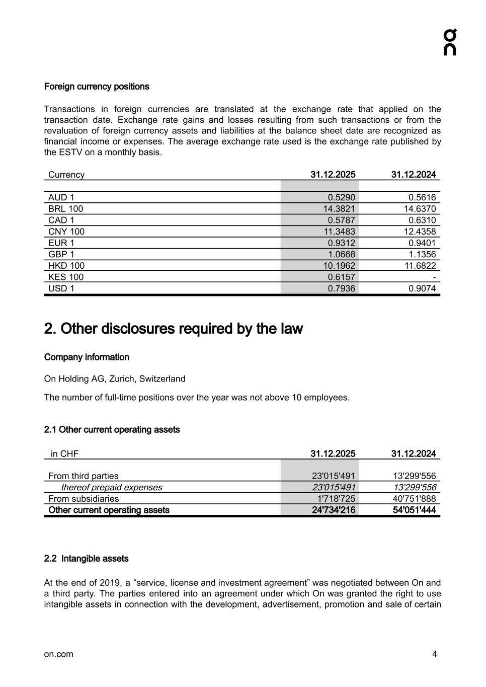 Foreign currency positions Transactions in foreign currencies are translated at the exchange rate that applied on the transaction date. Exchange rate gains and losses resulting from such transactions or from the revaluation of foreign currency assets and liabilities at the balance sheet date are recognized as financial income or expenses. The average exchange rate used is the exchange rate published by the ESTV on a monthly basis. Currency 31.12.2025 31.12.2024 AUD 1 0.5290 0.5616 BRL 100 14.3821 14.6370 CAD 1 0.5787 0.6310 CNY 100 11.3483 12.4358 EUR 1 0.9312 0.9401 GBP 1 1.0668 1.1356 HKD 100 10.1962 11.6822 KES 100 0.6157 - USD 1 0.7936 0.9074 2. Other disclosures required by the law Company information On Holding AG, Zurich, Switzerland The number of full-time positions over the year was not above 10 employees. 2.1Other current operating assets in CHF 31.12.2025 31.12.2024 From third parties 23'015'491 13'299'556 thereof prepaid expenses 23'015'491 13'299'556 From subsidiaries 1'718'725 40'751'888 Other current operating assets 24'734'216 54'051'444 2.2 Intangible assets At the end of 2019, a “service, license and investment agreement” was negotiated between On and a third party. The parties entered into an agreement under which On was granted the right to use intangible assets in connection with the development, advertisement, promotion and sale of certain on.com 4