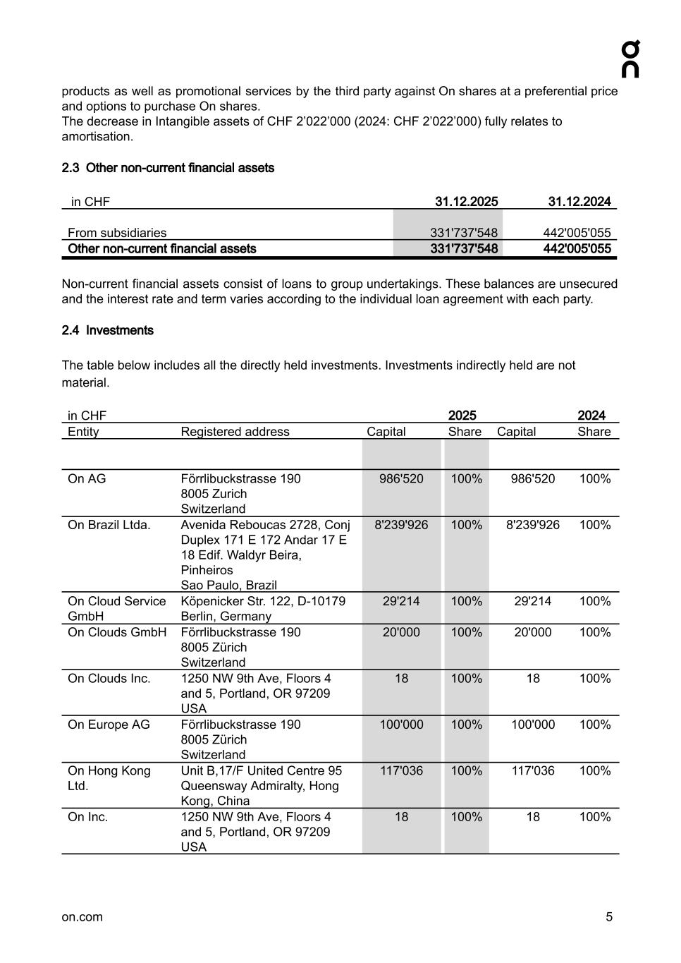 products as well as promotional services by the third party against On shares at a preferential price and options to purchase On shares. The decrease in Intangible assets of CHF 2’022’000 (2024: CHF 2’022’000) fully relates to amortisation. 2.3 Other non-current financial assets in CHF 31.12.2025 31.12.2024 From subsidiaries 331'737'548 442'005'055 Other non-current financial assets 331'737'548 442'005'055 Non-current financial assets consist of loans to group undertakings. These balances are unsecured and the interest rate and term varies according to the individual loan agreement with each party. 2.4 Investments The table below includes all the directly held investments. Investments indirectly held are not material. in CHF 2025 2024 Entity Registered address Capital Share Capital Share On AG Förrlibuckstrasse 190 8005 Zurich Switzerland 986'520 100% 986'520 100% On Brazil Ltda. Avenida Reboucas 2728, Conj Duplex 171 E 172 Andar 17 E 18 Edif. Waldyr Beira, Pinheiros Sao Paulo, Brazil 8'239'926 100% 8'239'926 100% On Cloud Service GmbH Köpenicker Str. 122, D-10179 Berlin, Germany 29'214 100% 29'214 100% On Clouds GmbH Förrlibuckstrasse 190 8005 Zürich Switzerland 20'000 100% 20'000 100% On Clouds Inc. 1250 NW 9th Ave, Floors 4 and 5, Portland, OR 97209 USA 18 100% 18 100% On Europe AG Förrlibuckstrasse 190 8005 Zürich Switzerland 100'000 100% 100'000 100% On Hong Kong Ltd. Unit B,17/F United Centre 95 Queensway Admiralty, Hong Kong, China 117'036 100% 117'036 100% On Inc. 1250 NW 9th Ave, Floors 4 and 5, Portland, OR 97209 USA 18 100% 18 100% on.com 5