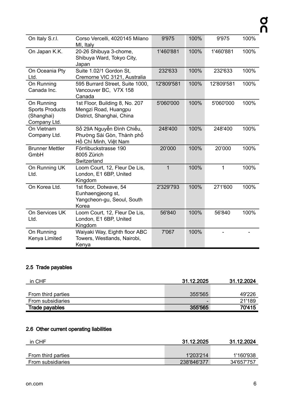On Italy S.r.l. Corso Vercelli, 4020145 Milano MI, Italy 9'975 100% 9'975 100% On Japan K.K. 20-26 Shibuya 3-chome, Shibuya Ward, Tokyo City, Japan 1'460'881 100% 1'460'881 100% On Oceania Pty Ltd. Suite 1.02/1 Gordon St, Cremorne VIC 3121, Australia 232'633 100% 232'633 100% On Running Canada Inc. 595 Burrard Street, Suite 1000, Vancouver BC, V7X 158 Canada 12'809'581 100% 12'809'581 100% On Running Sports Products (Shanghai) Company Ltd. 1st Floor, Building 8, No. 207 Mengzi Road, Huangpu District, Shanghai, China 5'060'000 100% 5'060'000 100% On Vietnam Company Ltd. Số 29A Nguyễn Đình Chiểu, Phường Sài Gòn, Thành phố Hồ Chí Minh, Việt Nam 248'400 100% 248'400 100% Brunner Mettler GmbH Förrlibuckstrasse 190 8005 Zürich Switzerland 20’000 100% 20’000 100% On Running UK Ltd. Loom Court, 12, Fleur De Lis, London, E1 6BP, United Kingdom 1 100% 1 100% On Korea Ltd. 1st floor, Dotwave, 54 Eunhaengjeong st, Yangcheon-gu, Seoul, South Korea 2'329'793 100% 271'600 100% On Services UK Ltd. Loom Court, 12, Fleur De Lis, London, E1 6BP, United Kingdom 56'840 100% 56'840 100% On Running Kenya Limited Waiyaki Way, Eighth floor ABC Towers, Westlands, Nairobi, Kenya 7'067 100% - - 2.5 Trade payables in CHF 31.12.2025 31.12.2024 From third parties 355'565 49'226 From subsidiaries - 21'189 Trade payables 355'565 70'415 2.6 Other current operating liabilities in CHF 31.12.2025 31.12.2024 From third parties 1'203'214 1'160'938 From subsidiaries 238'846'377 34'657'757 on.com 6