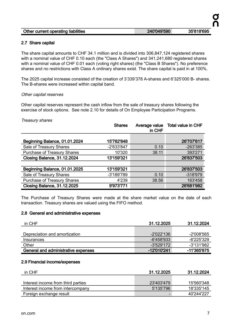 Other current operating liabilities 240'049'590 35'818'695 2.7 Share capital The share capital amounts to CHF 34.1 million and is divided into 306,847,124 registered shares with a nominal value of CHF 0.10 each (the "Class A Shares") and 341,241,680 registered shares with a nominal value of CHF 0.01 each (voting right shares) (the "Class B Shares"). No preference shares and no restrictions with Class A ordinary shares exist. The share capital is paid in at 100%. The 2025 capital increase consisted of the creation of 3’339’378 A-shares and 6’325’000 B- shares. The B-shares were increased within capital band. Other capital reserves Other capital reserves represent the cash inflow from the sale of treasury shares following the exercise of stock options. See note 2.10 for details of On Employee Participation Programs. Treasury shares Shares Average value in CHF Total value in CHF Beginning Balance, 01.01.2024 15'782'848 26'707'617 Sale of Treasury Shares -2'633'847 0.10 -263'385 Purchase of Treasury Shares 10'320 38.11 393'271 Closing Balance, 31.12.2024 13'159'321 26'837'503 Beginning Balance, 01.01.2025 13'159'321 26'837'503 Sale of Treasury Shares -3'189'789 0.10 -318'979 Purchase of Treasury Shares 4'239 38.56 163'458 Closing Balance, 31.12.2025 9'973'771 26'681'982 The Purchase of Treasury Shares were made at the share market value on the date of each transaction. Treasury shares are valued using the FIFO method. 2.8 General and administrative expenses in CHF 31.12.2025 31.12.2024 Depreciation and amortization -2'022'136 -2'008'565 Insurances -6'458'933 -6'225'329 Other -3'529'172 -3'131'982 General and administrative expenses -12'010'241 -11'365'875 2.9Financial income/expenses in CHF 31.12.2025 31.12.2024 Interest income from third parties 23'403'479 15'560'348 Interest income from intercompany 5'135'796 18'335'145 Foreign exchange result - 40'244'227 on.com 7