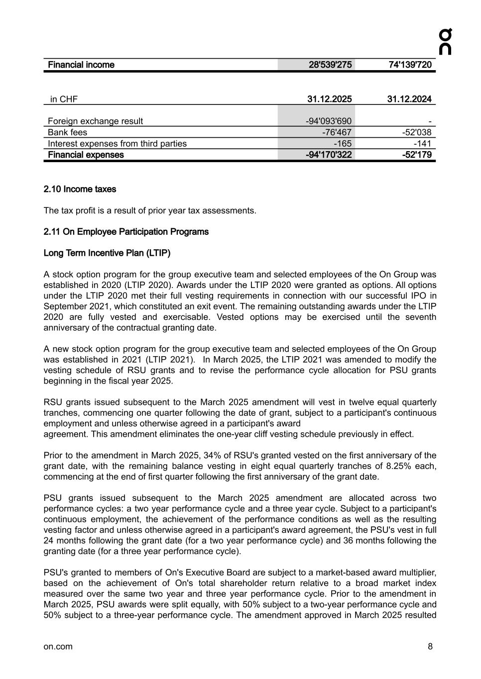 Financial income 28'539'275 74'139'720 in CHF 31.12.2025 31.12.2024 Foreign exchange result -94'093'690 - Bank fees -76'467 -52'038 Interest expenses from third parties -165 -141 Financial expenses -94'170'322 -52'179 2.10 Income taxes The tax profit is a result of prior year tax assessments. 2.11 On Employee Participation Programs Long Term Incentive Plan (LTIP) A stock option program for the group executive team and selected employees of the On Group was established in 2020 (LTIP 2020). Awards under the LTIP 2020 were granted as options. All options under the LTIP 2020 met their full vesting requirements in connection with our successful IPO in September 2021, which constituted an exit event. The remaining outstanding awards under the LTIP 2020 are fully vested and exercisable. Vested options may be exercised until the seventh anniversary of the contractual granting date. A new stock option program for the group executive team and selected employees of the On Group was established in 2021 (LTIP 2021). In March 2025, the LTIP 2021 was amended to modify the vesting schedule of RSU grants and to revise the performance cycle allocation for PSU grants beginning in the fiscal year 2025. RSU grants issued subsequent to the March 2025 amendment will vest in twelve equal quarterly tranches, commencing one quarter following the date of grant, subject to a participant's continuous employment and unless otherwise agreed in a participant's award agreement. This amendment eliminates the one-year cliff vesting schedule previously in effect. Prior to the amendment in March 2025, 34% of RSU's granted vested on the first anniversary of the grant date, with the remaining balance vesting in eight equal quarterly tranches of 8.25% each, commencing at the end of first quarter following the first anniversary of the grant date. PSU grants issued subsequent to the March 2025 amendment are allocated across two performance cycles: a two year performance cycle and a three year cycle. Subject to a participant's continuous employment, the achievement of the performance conditions as well as the resulting vesting factor and unless otherwise agreed in a participant's award agreement, the PSU's vest in full 24 months following the grant date (for a two year performance cycle) and 36 months following the granting date (for a three year performance cycle). PSU's granted to members of On's Executive Board are subject to a market-based award multiplier, based on the achievement of On's total shareholder return relative to a broad market index measured over the same two year and three year performance cycle. Prior to the amendment in March 2025, PSU awards were split equally, with 50% subject to a two-year performance cycle and 50% subject to a three-year performance cycle. The amendment approved in March 2025 resulted on.com 8