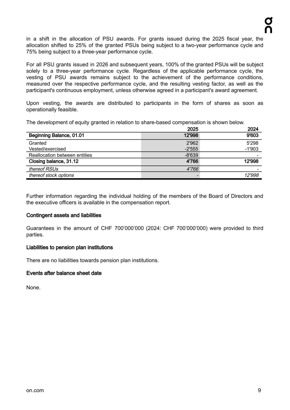 in a shift in the allocation of PSU awards. For grants issued during the 2025 fiscal year, the allocation shifted to 25% of the granted PSUs being subject to a two-year performance cycle and 75% being subject to a three-year performance cycle. For all PSU grants issued in 2026 and subsequent years, 100% of the granted PSUs will be subject solely to a three-year performance cycle. Regardless of the applicable performance cycle, the vesting of PSU awards remains subject to the achievement of the performance conditions, measured over the respective performance cycle, and the resulting vesting factor, as well as the participant's continuous employment, unless otherwise agreed in a participant's award agreement. Upon vesting, the awards are distributed to participants in the form of shares as soon as operationally feasible. The development of equity granted in relation to share-based compensation is shown below. Further information regarding the individual holding of the members of the Board of Directors and the executive officers is available in the compensation report. Contingent assets and liabilities Guarantees in the amount of CHF 700’000’000 (2024: CHF 700’000’000) were provided to third parties. Liabilities to pension plan institutions There are no liabilities towards pension plan institutions. Events after balance sheet date None. on.com 9 2025 2024 Beginning Balance, 01.01 12'998 9'603 Granted 2'962 5'298 Vested/exercised -2'555 -1'903 Reallocation between entities -8'639 - Closing balance, 31.12 4'766 12'998 thereof RSUs 4'766 - thereof stock options - 12'998