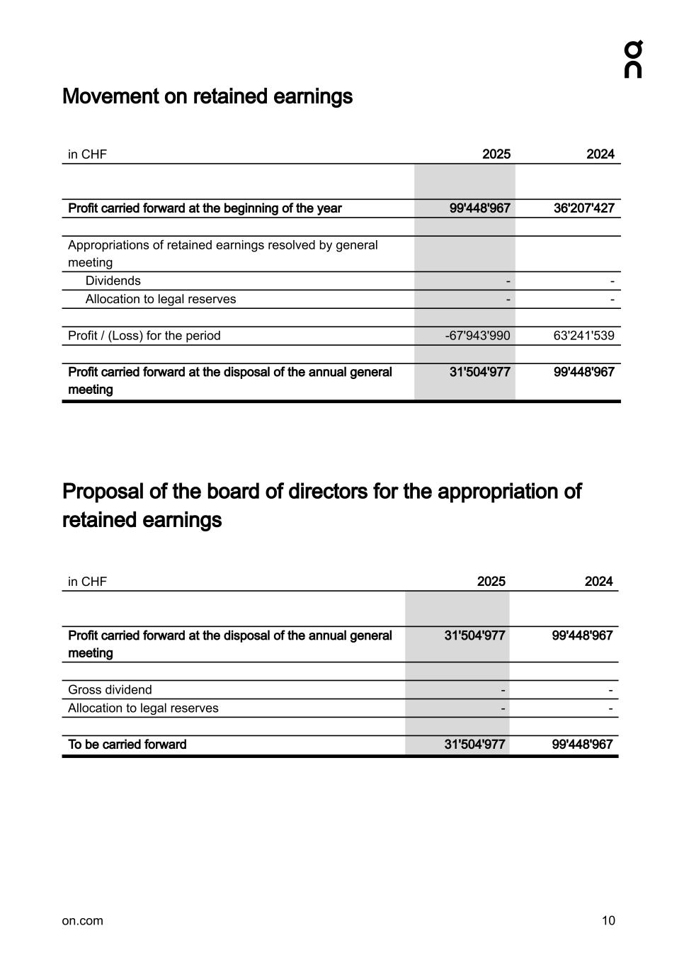 Movement on retained earnings in CHF 2025 2024 Profit carried forward at the beginning of the year 99'448'967 36'207'427 Appropriations of retained earnings resolved by general meeting Dividends - - Allocation to legal reserves - - Profit / (Loss) for the period -67'943'990 63'241'539 Profit carried forward at the disposal of the annual general meeting 31'504'977 99'448'967 Proposal of the board of directors for the appropriation of retained earnings in CHF 2025 2024 Profit carried forward at the disposal of the annual general meeting 31'504'977 99'448'967 Gross dividend - - Allocation to legal reserves - - To be carried forward 31'504'977 99'448'967 on.com 10