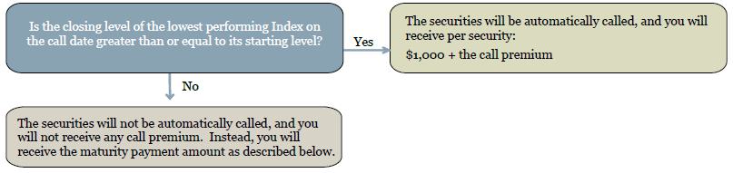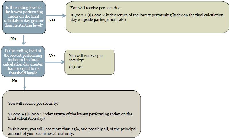 If the securities are not automatically called on the call date, you will be entitled to receive on the stated maturity date a cash payment per security in U.S. dollars equal to the maturity payment amount. The “maturity payment amount” per security will equal: · if the ending level of the lowest performing Index on the final calculation day is greater than its starting level: $1,000 + ($1,000 × index return of the lowest performing Index on the final calculation day × upside participation rate); · if the ending level of the lowest performing Index on the final calculation day is less than or equal to its starting level, but greater than or equal to its threshold level: $1,000; or · if the ending level of the lowest performing Index on the final calculation day is less than its threshold level: $1,000 + ($1,000 × index return of the lowest performing Index on the final calculation day) If the securities are not automatically called and the ending level of the lowest performing Index on the final calculation day is less than its threshold level, you will have full downside exposure to the decrease in the level of that Index from its starting level and you will lose more than 25%, and possibly all, of the principal amount of your securities at maturity. |