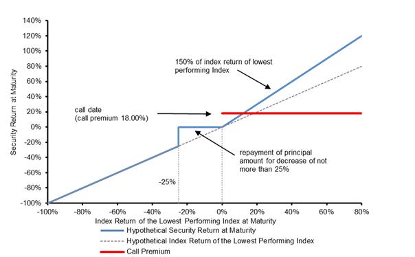 Because the hypothetical closing level of the lowest performing Index on the call date is greater than its hypothetical starting level, the securities are automatically called on the call date and you will receive on the call settlement date the principal amount of your securities plus the call premium of 18.00% of the principal amount. Even though the lowest performing Index on the call date appreciated by 30.00% from its hypothetical starting level to its hypothetical closing level on the call date in this example, your return is limited to the call premium of 18.00%.