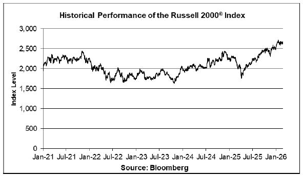 The following graph sets forth the historical performance of the Russell 2000® Index based on the daily historical closing levels of the Russell 2000® Index from January 4, 2021 through February 27, 2026. The closing level of the Russell 2000® Index on February 27, 2026 was 2,632.361. We obtained the closing levels above and below from Bloomberg, without independent verification.