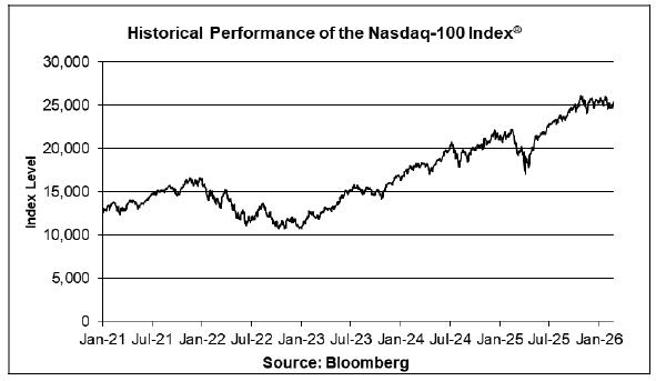 The following graph sets forth the historical performance of the Nasdaq-100 Index® based on the daily historical closing levels of the Nasdaq-100 Index® from January 4, 2021 through February 27, 2026. The closing level of the Nasdaq-100 Index® on February 27, 2026 was 24,960.04. We obtained the closing levels above and below from Bloomberg, without independent verification.