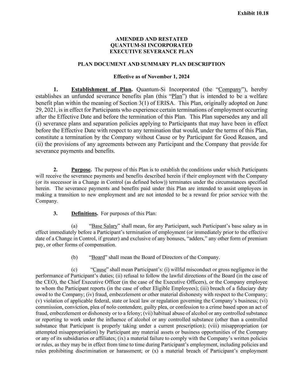 AMENDED AND RESTATED QUANTUM-SI INCORPORATED EXECUTIVE SEVERANCE PLAN PLAN DOCUMENT AND SUMMARY PLAN DESCRIPTION Effective as of November 1, 2024 1. Establishment of Plan. Quantum-Si Incorporated (the “Company”), hereby establishes an unfunded severance benefits plan (this “Plan”) that is intended to be a welfare benefit plan within the meaning of Section 3(1) of ERISA. This Plan, originally adopted on June 29, 2021, is in effect for Participants who experience certain terminations of employment occurring after the Effective Date and before the termination of this Plan. This Plan supersedes any and all (i) severance plans and separation policies applying to Participants that may have been in effect before the Effective Date with respect to any termination that would, under the terms of this Plan, constitute a termination by the Company without Cause or by Participant for Good Reason, and (ii) the provisions of any agreements between any Participant and the Company that provide for severance payments and benefits. 2. Purpose. The purpose of this Plan is to establish the conditions under which Participants will receive the severance payments and benefits described herein if their employment with the Company (or its successor in a Change in Control (as defined below)) terminates under the circumstances specified herein. The severance payments and benefits paid under this Plan are intended to assist employees in making a transition to new employment and are not intended to be a reward for prior service with the Company. 3. Definitions. For purposes of this Plan: (a) “Base Salary” shall mean, for any Participant, such Participant’s base salary as in effect immediately before a Participant’s termination of employment (or immediately prior to the effective date of a Change in Control, if greater) and exclusive of any bonuses, “adders,” any other form of premium pay, or other forms of compensation. (b) “Board” shall mean the Board of Directors of the Company. (c) “Cause” shall mean Participant’s: (i) willful misconduct or gross negligence in the performance of Participant’s duties; (ii) refusal to follow the lawful directions of the Board (in the case of the CEO), the Chief Executive Officer (in the case of the Executive Officers), or the Company employee to whom the Participant reports (in the case of other Eligible Employees); (iii) breach of a fiduciary duty owed to the Company; (iv) fraud, embezzlement or other material dishonesty with respect to the Company; (v) violation of applicable federal, state or local law or regulation governing the Company’s business; (vi) commission, conviction, plea of nolo contendere, guilty plea, or confession to a crime based upon an act of fraud, embezzlement or dishonesty or to a felony; (vii) habitual abuse of alcohol or any controlled substance or reporting to work under the influence of alcohol or any controlled substance (other than a controlled substance that Participant is properly taking under a current prescription); (viii) misappropriation (or attempted misappropriation) by Participant any material assets or business opportunities of the Company or any of its subsidiaries or affiliates; (ix) a material failure to comply with the Company’s written policies or rules, as they may be in effect from time to time during Participant’s employment, including policies and rules prohibiting discrimination or harassment; or (x) a material breach of Participant’s employment Exhibit 10.18