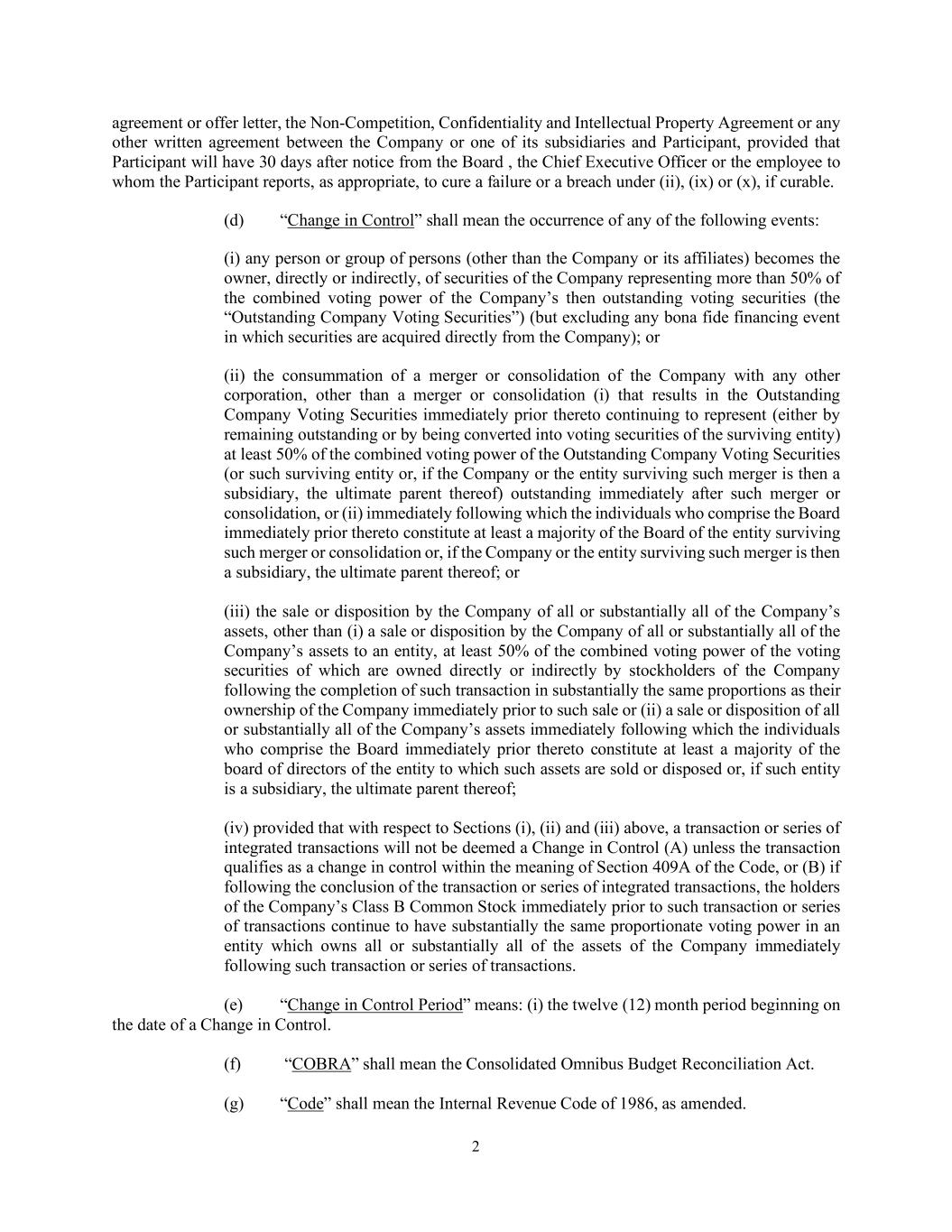 2 agreement or offer letter, the Non-Competition, Confidentiality and Intellectual Property Agreement or any other written agreement between the Company or one of its subsidiaries and Participant, provided that Participant will have 30 days after notice from the Board , the Chief Executive Officer or the employee to whom the Participant reports, as appropriate, to cure a failure or a breach under (ii), (ix) or (x), if curable. (d) “Change in Control” shall mean the occurrence of any of the following events: (i) any person or group of persons (other than the Company or its affiliates) becomes the owner, directly or indirectly, of securities of the Company representing more than 50% of the combined voting power of the Company’s then outstanding voting securities (the “Outstanding Company Voting Securities”) (but excluding any bona fide financing event in which securities are acquired directly from the Company); or (ii) the consummation of a merger or consolidation of the Company with any other corporation, other than a merger or consolidation (i) that results in the Outstanding Company Voting Securities immediately prior thereto continuing to represent (either by remaining outstanding or by being converted into voting securities of the surviving entity) at least 50% of the combined voting power of the Outstanding Company Voting Securities (or such surviving entity or, if the Company or the entity surviving such merger is then a subsidiary, the ultimate parent thereof) outstanding immediately after such merger or consolidation, or (ii) immediately following which the individuals who comprise the Board immediately prior thereto constitute at least a majority of the Board of the entity surviving such merger or consolidation or, if the Company or the entity surviving such merger is then a subsidiary, the ultimate parent thereof; or (iii) the sale or disposition by the Company of all or substantially all of the Company’s assets, other than (i) a sale or disposition by the Company of all or substantially all of the Company’s assets to an entity, at least 50% of the combined voting power of the voting securities of which are owned directly or indirectly by stockholders of the Company following the completion of such transaction in substantially the same proportions as their ownership of the Company immediately prior to such sale or (ii) a sale or disposition of all or substantially all of the Company’s assets immediately following which the individuals who comprise the Board immediately prior thereto constitute at least a majority of the board of directors of the entity to which such assets are sold or disposed or, if such entity is a subsidiary, the ultimate parent thereof; (iv) provided that with respect to Sections (i), (ii) and (iii) above, a transaction or series of integrated transactions will not be deemed a Change in Control (A) unless the transaction qualifies as a change in control within the meaning of Section 409A of the Code, or (B) if following the conclusion of the transaction or series of integrated transactions, the holders of the Company’s Class B Common Stock immediately prior to such transaction or series of transactions continue to have substantially the same proportionate voting power in an entity which owns all or substantially all of the assets of the Company immediately following such transaction or series of transactions. (e) “Change in Control Period” means: (i) the twelve (12) month period beginning on the date of a Change in Control. (f) “COBRA” shall mean the Consolidated Omnibus Budget Reconciliation Act. (g) “Code” shall mean the Internal Revenue Code of 1986, as amended.