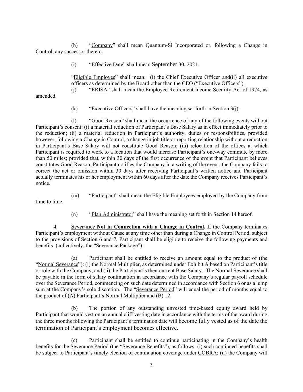 3 (h) “Company” shall mean Quantum-Si Incorporated or, following a Change in Control, any successor thereto. (i) “Effective Date” shall mean September 30, 2021. “Eligible Employee” shall mean: (i) the Chief Executive Officer and(ii) all executive officers as determined by the Board other than the CEO (“Executive Officers”). (j) “ERISA” shall mean the Employee Retirement Income Security Act of 1974, as amended. (k) “Executive Officers” shall have the meaning set forth in Section 3(j). (l) “Good Reason” shall mean the occurrence of any of the following events without Participant’s consent: (i) a material reduction of Participant’s Base Salary as in effect immediately prior to the reduction; (ii) a material reduction in Participant’s authority, duties or responsibilities, provided however, following a Change in Control, a change in job title or reporting relationship without a reduction in Participant’s Base Salary will not constitute Good Reason; (iii) relocation of the offices at which Participant is required to work to a location that would increase Participant’s one-way commute by more than 50 miles; provided that, within 30 days of the first occurrence of the event that Participant believes constitutes Good Reason, Participant notifies the Company in a writing of the event, the Company fails to correct the act or omission within 30 days after receiving Participant’s written notice and Participant actually terminates his or her employment within 60 days after the date the Company receives Participant’s notice. (m) “Participant” shall mean the Eligible Employees employed by the Company from time to time. (n) “Plan Administrator” shall have the meaning set forth in Section 14 hereof. 4. Severance Not in Connection with a Change in Control. If the Company terminates Participant’s employment without Cause at any time other than during a Change in Control Period, subject to the provisions of Section 6 and 7, Participant shall be eligible to receive the following payments and benefits (collectively, the “Severance Package”): (a) Participant shall be entitled to receive an amount equal to the product of (the “Normal Severance”): (i) the Normal Multiplier, as determined under Exhibit A based on Participant’s title or role with the Company; and (ii) the Participant’s then-current Base Salary. The Normal Severance shall be payable in the form of salary continuation in accordance with the Company’s regular payroll schedule over the Severance Period, commencing on such date determined in accordance with Section 6 or as a lump sum at the Company’s sole discretion. The “Severance Period” will equal the period of months equal to the product of (A) Participant’s Normal Multiplier and (B) 12. (b) The portion of any outstanding unvested time-based equity award held by Participant that would vest on an annual cliff vesting date in accordance with the terms of the award during the three months following the Participant’s termination date will become fully vested as of the date the termination of Participant’s employment becomes effective. (c) Participant shall be entitled to continue participating in the Company’s health benefits for the Severance Period (the “Severance Benefits”), as follows: (i) such continued benefits shall be subject to Participant’s timely election of continuation coverage under COBRA; (ii) the Company will