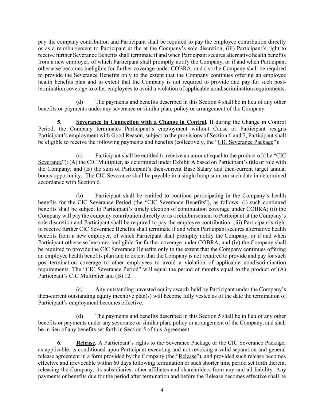 4 pay the company contribution and Participant shall be required to pay the employee contribution directly or as a reimbursement to Participant at the at the Company’s sole discretion, (iii) Participant’s right to receive further Severance Benefits shall terminate if and when Participant secures alternative health benefits from a new employer, of which Participant shall promptly notify the Company, or if and when Participant otherwise becomes ineligible for further coverage under COBRA; and (iv) the Company shall be required to provide the Severance Benefits only to the extent that the Company continues offering an employee health benefits plan and to extent that the Company is not required to provide and pay for such post- termination coverage to other employees to avoid a violation of applicable nondiscrimination requirements. (d) The payments and benefits described in this Section 4 shall be in lieu of any other benefits or payments under any severance or similar plan, policy or arrangement of the Company. 5. Severance in Connection with a Change in Control. If during the Change in Control Period, the Company terminates Participant’s employment without Cause or Participant resigns Participant’s employment with Good Reason, subject to the provisions of Section 6 and 7, Participant shall be eligible to receive the following payments and benefits (collectively, the “CIC Severance Package”): (a) Participant shall be entitled to receive an amount equal to the product of (the “CIC Severance”): (A) the CIC Multiplier, as determined under Exhibit A based on Participant’s title or role with the Company; and (B) the sum of Participant’s then-current Base Salary and then-current target annual bonus opportunity. The CIC Severance shall be payable in a single lump sum, on such date in determined accordance with Section 6. (b) Participant shall be entitled to continue participating in the Company’s health benefits for the CIC Severance Period (the “CIC Severance Benefits”), as follows: (i) such continued benefits shall be subject to Participant’s timely election of continuation coverage under COBRA; (ii) the Company will pay the company contribution directly or as a reimbursement to Participant at the Company’s sole discretion and Participant shall be required to pay the employee contribution; (iii) Participant’s right to receive further CIC Severance Benefits shall terminate if and when Participant secures alternative health benefits from a new employer, of which Participant shall promptly notify the Company, or if and when Participant otherwise becomes ineligible for further coverage under COBRA; and (iv) the Company shall be required to provide the CIC Severance Benefits only to the extent that the Company continues offering an employee health benefits plan and to extent that the Company is not required to provide and pay for such post-termination coverage to other employees to avoid a violation of applicable nondiscrimination requirements. The “CIC Severance Period” will equal the period of months equal to the product of (A) Participant’s CIC Multiplier and (B) 12. (c) Any outstanding unvested equity awards held by Participant under the Company’s then-current outstanding equity incentive plan(s) will become fully vested as of the date the termination of Participant’s employment becomes effective. (d) The payments and benefits described in this Section 5 shall be in lieu of any other benefits or payments under any severance or similar plan, policy or arrangement of the Company, and shall be in lieu of any benefits set forth in Section 5 of this Agreement. 6. Release. A Participant’s rights to the Severance Package or the CIC Severance Package, as applicable, is conditioned upon Participant executing and not revoking a valid separation and general release agreement in a form provided by the Company (the “Release”), and provided such release becomes effective and irrevocable within 60 days following termination or such shorter time period set forth therein, releasing the Company, its subsidiaries, other affiliates and shareholders from any and all liability. Any payments or benefits due for the period after termination and before the Release becomes effective shall be