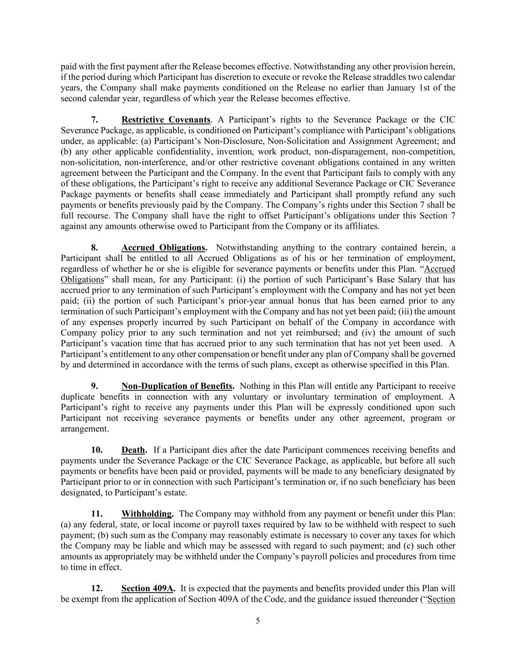 5 paid with the first payment after the Release becomes effective. Notwithstanding any other provision herein, if the period during which Participant has discretion to execute or revoke the Release straddles two calendar years, the Company shall make payments conditioned on the Release no earlier than January 1st of the second calendar year, regardless of which year the Release becomes effective. 7. Restrictive Covenants. A Participant’s rights to the Severance Package or the CIC Severance Package, as applicable, is conditioned on Participant’s compliance with Participant’s obligations under, as applicable: (a) Participant’s Non-Disclosure, Non-Solicitation and Assignment Agreement; and (b) any other applicable confidentiality, invention, work product, non-disparagement, non-competition, non-solicitation, non-interference, and/or other restrictive covenant obligations contained in any written agreement between the Participant and the Company. In the event that Participant fails to comply with any of these obligations, the Participant’s right to receive any additional Severance Package or CIC Severance Package payments or benefits shall cease immediately and Participant shall promptly refund any such payments or benefits previously paid by the Company. The Company’s rights under this Section 7 shall be full recourse. The Company shall have the right to offset Participant’s obligations under this Section 7 against any amounts otherwise owed to Participant from the Company or its affiliates. 8. Accrued Obligations. Notwithstanding anything to the contrary contained herein, a Participant shall be entitled to all Accrued Obligations as of his or her termination of employment, regardless of whether he or she is eligible for severance payments or benefits under this Plan. “Accrued Obligations” shall mean, for any Participant: (i) the portion of such Participant’s Base Salary that has accrued prior to any termination of such Participant’s employment with the Company and has not yet been paid; (ii) the portion of such Participant’s prior-year annual bonus that has been earned prior to any termination of such Participant’s employment with the Company and has not yet been paid; (iii) the amount of any expenses properly incurred by such Participant on behalf of the Company in accordance with Company policy prior to any such termination and not yet reimbursed; and (iv) the amount of such Participant’s vacation time that has accrued prior to any such termination that has not yet been used. A Participant’s entitlement to any other compensation or benefit under any plan of Company shall be governed by and determined in accordance with the terms of such plans, except as otherwise specified in this Plan. 9. Non-Duplication of Benefits. Nothing in this Plan will entitle any Participant to receive duplicate benefits in connection with any voluntary or involuntary termination of employment. A Participant’s right to receive any payments under this Plan will be expressly conditioned upon such Participant not receiving severance payments or benefits under any other agreement, program or arrangement. 10. Death. If a Participant dies after the date Participant commences receiving benefits and payments under the Severance Package or the CIC Severance Package, as applicable, but before all such payments or benefits have been paid or provided, payments will be made to any beneficiary designated by Participant prior to or in connection with such Participant’s termination or, if no such beneficiary has been designated, to Participant’s estate. 11. Withholding. The Company may withhold from any payment or benefit under this Plan: (a) any federal, state, or local income or payroll taxes required by law to be withheld with respect to such payment; (b) such sum as the Company may reasonably estimate is necessary to cover any taxes for which the Company may be liable and which may be assessed with regard to such payment; and (c) such other amounts as appropriately may be withheld under the Company’s payroll policies and procedures from time to time in effect. 12. Section 409A. It is expected that the payments and benefits provided under this Plan will be exempt from the application of Section 409A of the Code, and the guidance issued thereunder (“Section