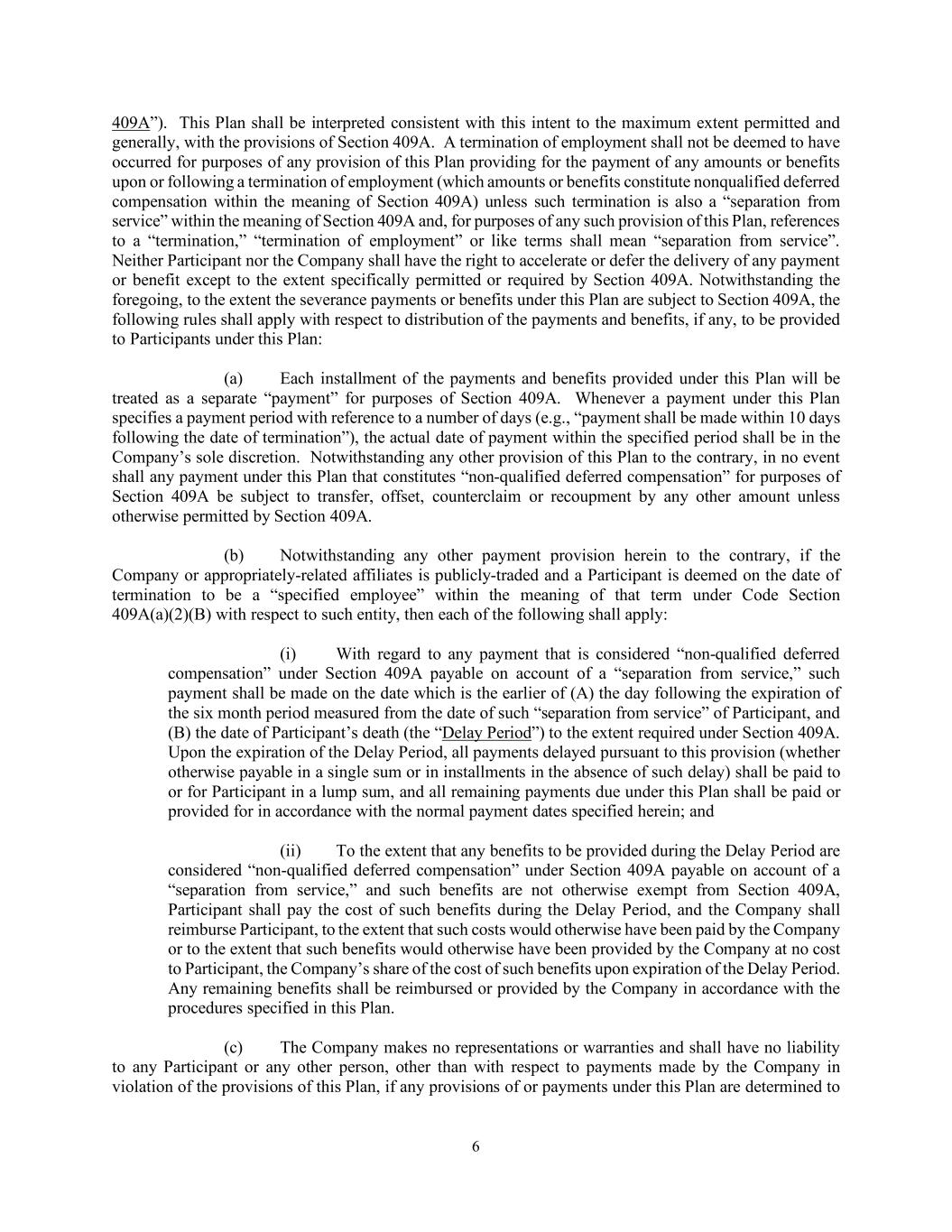 6 409A”). This Plan shall be interpreted consistent with this intent to the maximum extent permitted and generally, with the provisions of Section 409A. A termination of employment shall not be deemed to have occurred for purposes of any provision of this Plan providing for the payment of any amounts or benefits upon or following a termination of employment (which amounts or benefits constitute nonqualified deferred compensation within the meaning of Section 409A) unless such termination is also a “separation from service” within the meaning of Section 409A and, for purposes of any such provision of this Plan, references to a “termination,” “termination of employment” or like terms shall mean “separation from service”. Neither Participant nor the Company shall have the right to accelerate or defer the delivery of any payment or benefit except to the extent specifically permitted or required by Section 409A. Notwithstanding the foregoing, to the extent the severance payments or benefits under this Plan are subject to Section 409A, the following rules shall apply with respect to distribution of the payments and benefits, if any, to be provided to Participants under this Plan: (a) Each installment of the payments and benefits provided under this Plan will be treated as a separate “payment” for purposes of Section 409A. Whenever a payment under this Plan specifies a payment period with reference to a number of days (e.g., “payment shall be made within 10 days following the date of termination”), the actual date of payment within the specified period shall be in the Company’s sole discretion. Notwithstanding any other provision of this Plan to the contrary, in no event shall any payment under this Plan that constitutes “non-qualified deferred compensation” for purposes of Section 409A be subject to transfer, offset, counterclaim or recoupment by any other amount unless otherwise permitted by Section 409A. (b) Notwithstanding any other payment provision herein to the contrary, if the Company or appropriately-related affiliates is publicly-traded and a Participant is deemed on the date of termination to be a “specified employee” within the meaning of that term under Code Section 409A(a)(2)(B) with respect to such entity, then each of the following shall apply: (i) With regard to any payment that is considered “non-qualified deferred compensation” under Section 409A payable on account of a “separation from service,” such payment shall be made on the date which is the earlier of (A) the day following the expiration of the six month period measured from the date of such “separation from service” of Participant, and (B) the date of Participant’s death (the “Delay Period”) to the extent required under Section 409A. Upon the expiration of the Delay Period, all payments delayed pursuant to this provision (whether otherwise payable in a single sum or in installments in the absence of such delay) shall be paid to or for Participant in a lump sum, and all remaining payments due under this Plan shall be paid or provided for in accordance with the normal payment dates specified herein; and (ii) To the extent that any benefits to be provided during the Delay Period are considered “non-qualified deferred compensation” under Section 409A payable on account of a “separation from service,” and such benefits are not otherwise exempt from Section 409A, Participant shall pay the cost of such benefits during the Delay Period, and the Company shall reimburse Participant, to the extent that such costs would otherwise have been paid by the Company or to the extent that such benefits would otherwise have been provided by the Company at no cost to Participant, the Company’s share of the cost of such benefits upon expiration of the Delay Period. Any remaining benefits shall be reimbursed or provided by the Company in accordance with the procedures specified in this Plan. (c) The Company makes no representations or warranties and shall have no liability to any Participant or any other person, other than with respect to payments made by the Company in violation of the provisions of this Plan, if any provisions of or payments under this Plan are determined to