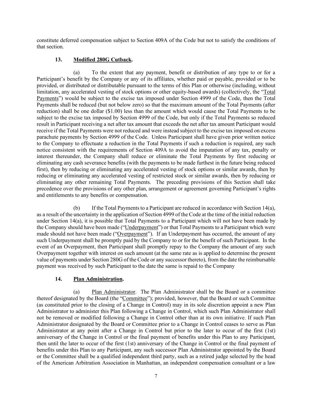 7 constitute deferred compensation subject to Section 409A of the Code but not to satisfy the conditions of that section. 13. Modified 280G Cutback. (a) To the extent that any payment, benefit or distribution of any type to or for a Participant’s benefit by the Company or any of its affiliates, whether paid or payable, provided or to be provided, or distributed or distributable pursuant to the terms of this Plan or otherwise (including, without limitation, any accelerated vesting of stock options or other equity-based awards) (collectively, the “Total Payments”) would be subject to the excise tax imposed under Section 4999 of the Code, then the Total Payments shall be reduced (but not below zero) so that the maximum amount of the Total Payments (after reduction) shall be one dollar ($1.00) less than the amount which would cause the Total Payments to be subject to the excise tax imposed by Section 4999 of the Code, but only if the Total Payments so reduced result in Participant receiving a net after tax amount that exceeds the net after tax amount Participant would receive if the Total Payments were not reduced and were instead subject to the excise tax imposed on excess parachute payments by Section 4999 of the Code. Unless Participant shall have given prior written notice to the Company to effectuate a reduction in the Total Payments if such a reduction is required, any such notice consistent with the requirements of Section 409A to avoid the imputation of any tax, penalty or interest thereunder, the Company shall reduce or eliminate the Total Payments by first reducing or eliminating any cash severance benefits (with the payments to be made furthest in the future being reduced first), then by reducing or eliminating any accelerated vesting of stock options or similar awards, then by reducing or eliminating any accelerated vesting of restricted stock or similar awards, then by reducing or eliminating any other remaining Total Payments. The preceding provisions of this Section shall take precedence over the provisions of any other plan, arrangement or agreement governing Participant’s rights and entitlements to any benefits or compensation. (b) If the Total Payments to a Participant are reduced in accordance with Section 14(a), as a result of the uncertainty in the application of Section 4999 of the Code at the time of the initial reduction under Section 14(a), it is possible that Total Payments to a Participant which will not have been made by the Company should have been made (“Underpayment”) or that Total Payments to a Participant which were made should not have been made (“Overpayment”). If an Underpayment has occurred, the amount of any such Underpayment shall be promptly paid by the Company to or for the benefit of such Participant. In the event of an Overpayment, then Participant shall promptly repay to the Company the amount of any such Overpayment together with interest on such amount (at the same rate as is applied to determine the present value of payments under Section 280G of the Code or any successor thereto), from the date the reimbursable payment was received by such Participant to the date the same is repaid to the Company 14. Plan Administration. (a) Plan Administrator. The Plan Administrator shall be the Board or a committee thereof designated by the Board (the “Committee”); provided, however, that the Board or such Committee (as constituted prior to the closing of a Change in Control) may in its sole discretion appoint a new Plan Administrator to administer this Plan following a Change in Control, which such Plan Administrator shall not be removed or modified following a Change in Control other than at its own initiative. If such Plan Administrator designated by the Board or Committee prior to a Change in Control ceases to serve as Plan Administrator at any point after a Change in Control but prior to the later to occur of the first (1st) anniversary of the Change in Control or the final payment of benefits under this Plan to any Participant, then until the later to occur of the first (1st) anniversary of the Change in Control or the final payment of benefits under this Plan to any Participant, any such successor Plan Administrator appointed by the Board or the Committee shall be a qualified independent third party, such as a retired judge selected by the head of the American Arbitration Association in Manhattan, an independent compensation consultant or a law