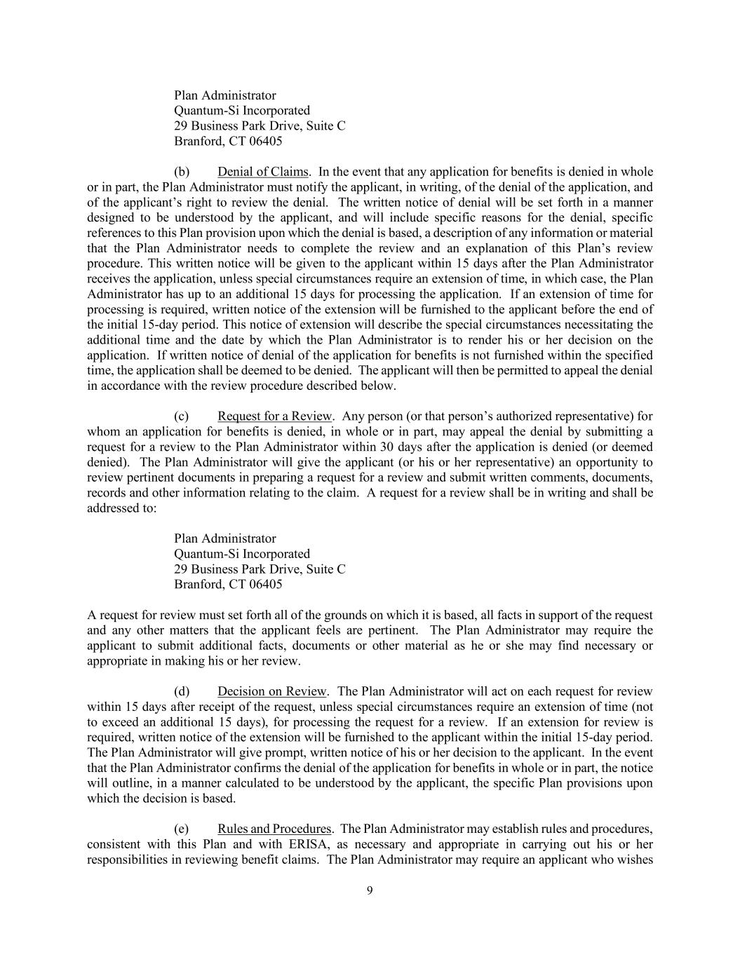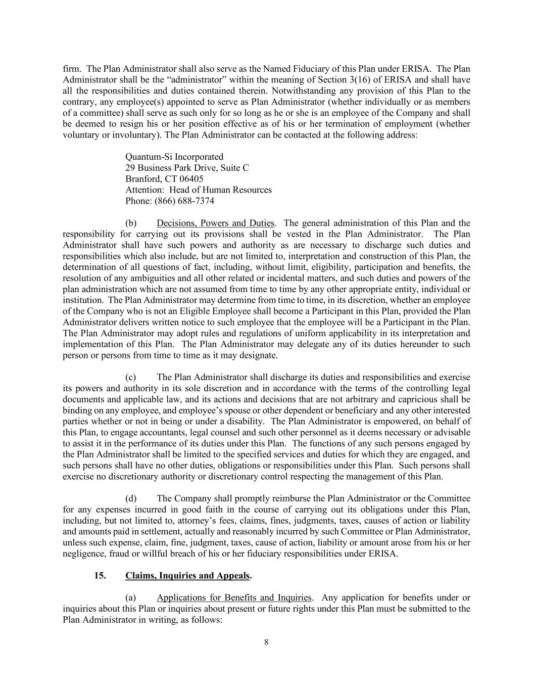 8 firm. The Plan Administrator shall also serve as the Named Fiduciary of this Plan under ERISA. The Plan Administrator shall be the “administrator” within the meaning of Section 3(16) of ERISA and shall have all the responsibilities and duties contained therein. Notwithstanding any provision of this Plan to the contrary, any employee(s) appointed to serve as Plan Administrator (whether individually or as members of a committee) shall serve as such only for so long as he or she is an employee of the Company and shall be deemed to resign his or her position effective as of his or her termination of employment (whether voluntary or involuntary). The Plan Administrator can be contacted at the following address: Quantum-Si Incorporated 29 Business Park Drive, Suite C Branford, CT 06405 Attention: Head of Human Resources Phone: (866) 688-7374 (b) Decisions, Powers and Duties. The general administration of this Plan and the responsibility for carrying out its provisions shall be vested in the Plan Administrator. The Plan Administrator shall have such powers and authority as are necessary to discharge such duties and responsibilities which also include, but are not limited to, interpretation and construction of this Plan, the determination of all questions of fact, including, without limit, eligibility, participation and benefits, the resolution of any ambiguities and all other related or incidental matters, and such duties and powers of the plan administration which are not assumed from time to time by any other appropriate entity, individual or institution. The Plan Administrator may determine from time to time, in its discretion, whether an employee of the Company who is not an Eligible Employee shall become a Participant in this Plan, provided the Plan Administrator delivers written notice to such employee that the employee will be a Participant in the Plan. The Plan Administrator may adopt rules and regulations of uniform applicability in its interpretation and implementation of this Plan. The Plan Administrator may delegate any of its duties hereunder to such person or persons from time to time as it may designate. (c) The Plan Administrator shall discharge its duties and responsibilities and exercise its powers and authority in its sole discretion and in accordance with the terms of the controlling legal documents and applicable law, and its actions and decisions that are not arbitrary and capricious shall be binding on any employee, and employee’s spouse or other dependent or beneficiary and any other interested parties whether or not in being or under a disability. The Plan Administrator is empowered, on behalf of this Plan, to engage accountants, legal counsel and such other personnel as it deems necessary or advisable to assist it in the performance of its duties under this Plan. The functions of any such persons engaged by the Plan Administrator shall be limited to the specified services and duties for which they are engaged, and such persons shall have no other duties, obligations or responsibilities under this Plan. Such persons shall exercise no discretionary authority or discretionary control respecting the management of this Plan. (d) The Company shall promptly reimburse the Plan Administrator or the Committee for any expenses incurred in good faith in the course of carrying out its obligations under this Plan, including, but not limited to, attorney’s fees, claims, fines, judgments, taxes, causes of action or liability and amounts paid in settlement, actually and reasonably incurred by such Committee or Plan Administrator, unless such expense, claim, fine, judgment, taxes, cause of action, liability or amount arose from his or her negligence, fraud or willful breach of his or her fiduciary responsibilities under ERISA. 15. Claims, Inquiries and Appeals. (a) Applications for Benefits and Inquiries. Any application for benefits under or inquiries about this Plan or inquiries about present or future rights under this Plan must be submitted to the Plan Administrator in writing, as follows: