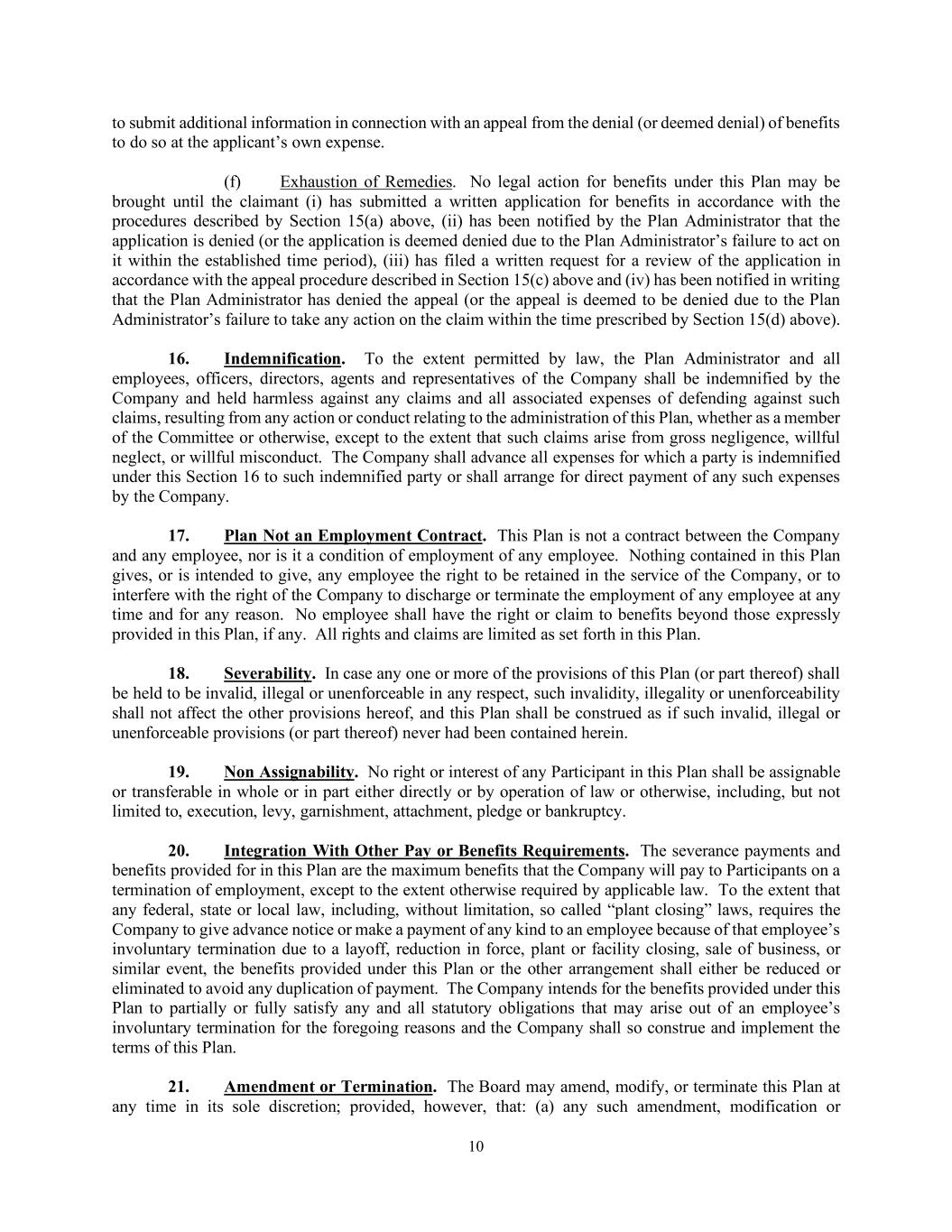 10 to submit additional information in connection with an appeal from the denial (or deemed denial) of benefits to do so at the applicant’s own expense. (f) Exhaustion of Remedies. No legal action for benefits under this Plan may be brought until the claimant (i) has submitted a written application for benefits in accordance with the procedures described by Section 15(a) above, (ii) has been notified by the Plan Administrator that the application is denied (or the application is deemed denied due to the Plan Administrator’s failure to act on it within the established time period), (iii) has filed a written request for a review of the application in accordance with the appeal procedure described in Section 15(c) above and (iv) has been notified in writing that the Plan Administrator has denied the appeal (or the appeal is deemed to be denied due to the Plan Administrator’s failure to take any action on the claim within the time prescribed by Section 15(d) above). 16. Indemnification. To the extent permitted by law, the Plan Administrator and all employees, officers, directors, agents and representatives of the Company shall be indemnified by the Company and held harmless against any claims and all associated expenses of defending against such claims, resulting from any action or conduct relating to the administration of this Plan, whether as a member of the Committee or otherwise, except to the extent that such claims arise from gross negligence, willful neglect, or willful misconduct. The Company shall advance all expenses for which a party is indemnified under this Section 16 to such indemnified party or shall arrange for direct payment of any such expenses by the Company. 17. Plan Not an Employment Contract. This Plan is not a contract between the Company and any employee, nor is it a condition of employment of any employee. Nothing contained in this Plan gives, or is intended to give, any employee the right to be retained in the service of the Company, or to interfere with the right of the Company to discharge or terminate the employment of any employee at any time and for any reason. No employee shall have the right or claim to benefits beyond those expressly provided in this Plan, if any. All rights and claims are limited as set forth in this Plan. 18. Severability. In case any one or more of the provisions of this Plan (or part thereof) shall be held to be invalid, illegal or unenforceable in any respect, such invalidity, illegality or unenforceability shall not affect the other provisions hereof, and this Plan shall be construed as if such invalid, illegal or unenforceable provisions (or part thereof) never had been contained herein. 19. Non Assignability. No right or interest of any Participant in this Plan shall be assignable or transferable in whole or in part either directly or by operation of law or otherwise, including, but not limited to, execution, levy, garnishment, attachment, pledge or bankruptcy. 20. Integration With Other Pay or Benefits Requirements. The severance payments and benefits provided for in this Plan are the maximum benefits that the Company will pay to Participants on a termination of employment, except to the extent otherwise required by applicable law. To the extent that any federal, state or local law, including, without limitation, so called “plant closing” laws, requires the Company to give advance notice or make a payment of any kind to an employee because of that employee’s involuntary termination due to a layoff, reduction in force, plant or facility closing, sale of business, or similar event, the benefits provided under this Plan or the other arrangement shall either be reduced or eliminated to avoid any duplication of payment. The Company intends for the benefits provided under this Plan to partially or fully satisfy any and all statutory obligations that may arise out of an employee’s involuntary termination for the foregoing reasons and the Company shall so construe and implement the terms of this Plan. 21. Amendment or Termination. The Board may amend, modify, or terminate this Plan at any time in its sole discretion; provided, however, that: (a) any such amendment, modification or
