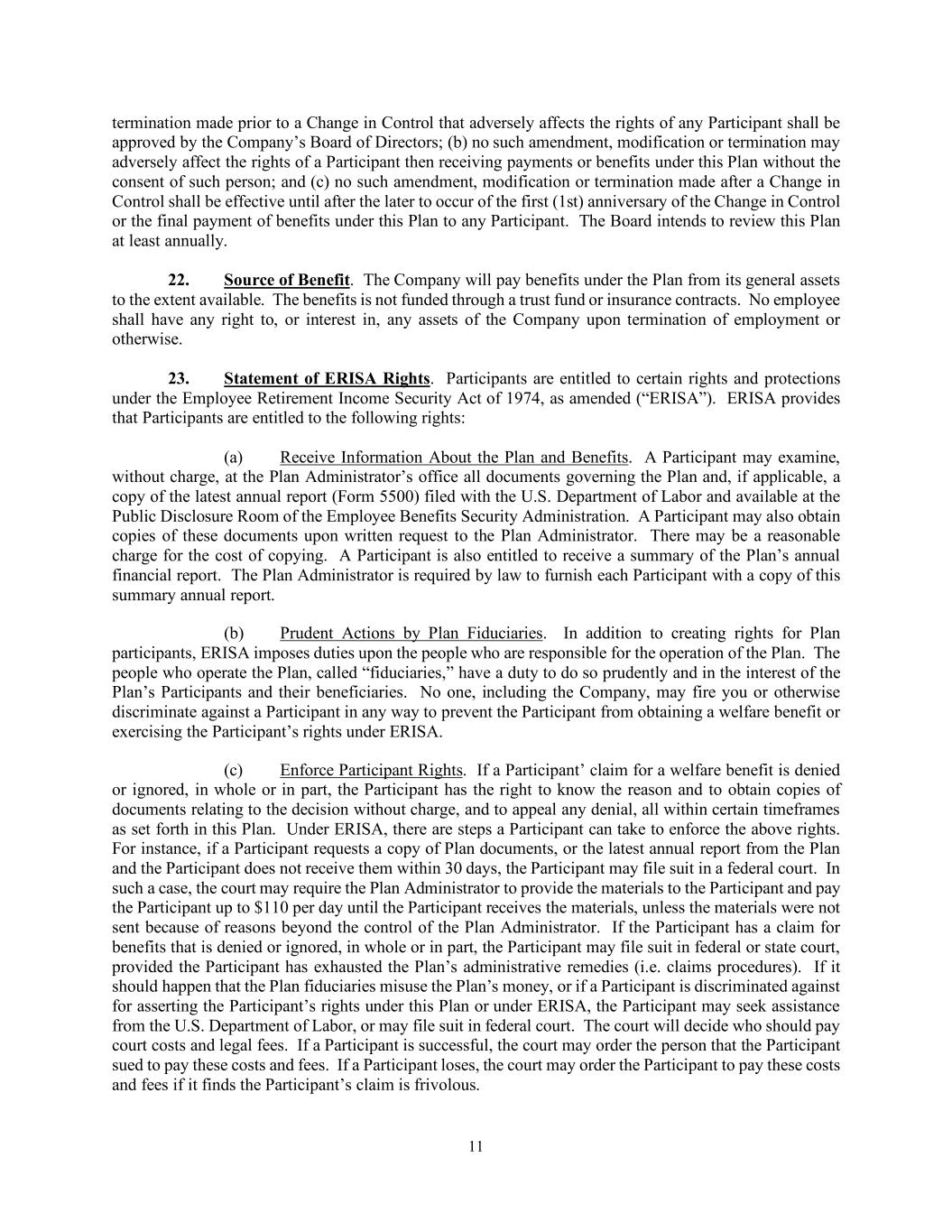 11 termination made prior to a Change in Control that adversely affects the rights of any Participant shall be approved by the Company’s Board of Directors; (b) no such amendment, modification or termination may adversely affect the rights of a Participant then receiving payments or benefits under this Plan without the consent of such person; and (c) no such amendment, modification or termination made after a Change in Control shall be effective until after the later to occur of the first (1st) anniversary of the Change in Control or the final payment of benefits under this Plan to any Participant. The Board intends to review this Plan at least annually. 22. Source of Benefit. The Company will pay benefits under the Plan from its general assets to the extent available. The benefits is not funded through a trust fund or insurance contracts. No employee shall have any right to, or interest in, any assets of the Company upon termination of employment or otherwise. 23. Statement of ERISA Rights. Participants are entitled to certain rights and protections under the Employee Retirement Income Security Act of 1974, as amended (“ERISA”). ERISA provides that Participants are entitled to the following rights: (a) Receive Information About the Plan and Benefits. A Participant may examine, without charge, at the Plan Administrator’s office all documents governing the Plan and, if applicable, a copy of the latest annual report (Form 5500) filed with the U.S. Department of Labor and available at the Public Disclosure Room of the Employee Benefits Security Administration. A Participant may also obtain copies of these documents upon written request to the Plan Administrator. There may be a reasonable charge for the cost of copying. A Participant is also entitled to receive a summary of the Plan’s annual financial report. The Plan Administrator is required by law to furnish each Participant with a copy of this summary annual report. (b) Prudent Actions by Plan Fiduciaries. In addition to creating rights for Plan participants, ERISA imposes duties upon the people who are responsible for the operation of the Plan. The people who operate the Plan, called “fiduciaries,” have a duty to do so prudently and in the interest of the Plan’s Participants and their beneficiaries. No one, including the Company, may fire you or otherwise discriminate against a Participant in any way to prevent the Participant from obtaining a welfare benefit or exercising the Participant’s rights under ERISA. (c) Enforce Participant Rights. If a Participant’ claim for a welfare benefit is denied or ignored, in whole or in part, the Participant has the right to know the reason and to obtain copies of documents relating to the decision without charge, and to appeal any denial, all within certain timeframes as set forth in this Plan. Under ERISA, there are steps a Participant can take to enforce the above rights. For instance, if a Participant requests a copy of Plan documents, or the latest annual report from the Plan and the Participant does not receive them within 30 days, the Participant may file suit in a federal court. In such a case, the court may require the Plan Administrator to provide the materials to the Participant and pay the Participant up to $110 per day until the Participant receives the materials, unless the materials were not sent because of reasons beyond the control of the Plan Administrator. If the Participant has a claim for benefits that is denied or ignored, in whole or in part, the Participant may file suit in federal or state court, provided the Participant has exhausted the Plan’s administrative remedies (i.e. claims procedures). If it should happen that the Plan fiduciaries misuse the Plan’s money, or if a Participant is discriminated against for asserting the Participant’s rights under this Plan or under ERISA, the Participant may seek assistance from the U.S. Department of Labor, or may file suit in federal court. The court will decide who should pay court costs and legal fees. If a Participant is successful, the court may order the person that the Participant sued to pay these costs and fees. If a Participant loses, the court may order the Participant to pay these costs and fees if it finds the Participant’s claim is frivolous.