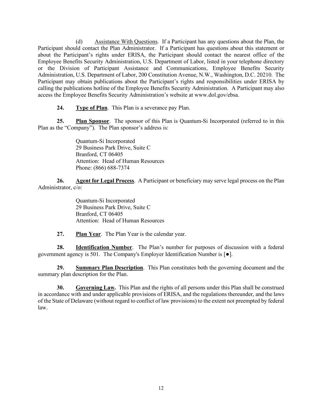 12 (d) Assistance With Questions. If a Participant has any questions about the Plan, the Participant should contact the Plan Administrator. If a Participant has questions about this statement or about the Participant’s rights under ERISA, the Participant should contact the nearest office of the Employee Benefits Security Administration, U.S. Department of Labor, listed in your telephone directory or the Division of Participant Assistance and Communications, Employee Benefits Security Administration, U.S. Department of Labor, 200 Constitution Avenue, N.W., Washington, D.C. 20210. The Participant may obtain publications about the Participant’s rights and responsibilities under ERISA by calling the publications hotline of the Employee Benefits Security Administration. A Participant may also access the Employee Benefits Security Administration’s website at www.dol.gov/ebsa. 24. Type of Plan. This Plan is a severance pay Plan. 25. Plan Sponsor. The sponsor of this Plan is Quantum-Si Incorporated (referred to in this Plan as the “Company”). The Plan sponsor’s address is: Quantum-Si Incorporated 29 Business Park Drive, Suite C Branford, CT 06405 Attention: Head of Human Resources Phone: (866) 688-7374 26. Agent for Legal Process. A Participant or beneficiary may serve legal process on the Plan Administrator, c/o: Quantum-Si Incorporated 29 Business Park Drive, Suite C Branford, CT 06405 Attention: Head of Human Resources 27. Plan Year. The Plan Year is the calendar year. 28. Identification Number. The Plan’s number for purposes of discussion with a federal government agency is 501. The Company's Employer Identification Number is [●]. 29. Summary Plan Description. This Plan constitutes both the governing document and the summary plan description for the Plan. 30. Governing Law. This Plan and the rights of all persons under this Plan shall be construed in accordance with and under applicable provisions of ERISA, and the regulations thereunder, and the laws of the State of Delaware (without regard to conflict of law provisions) to the extent not preempted by federal law.