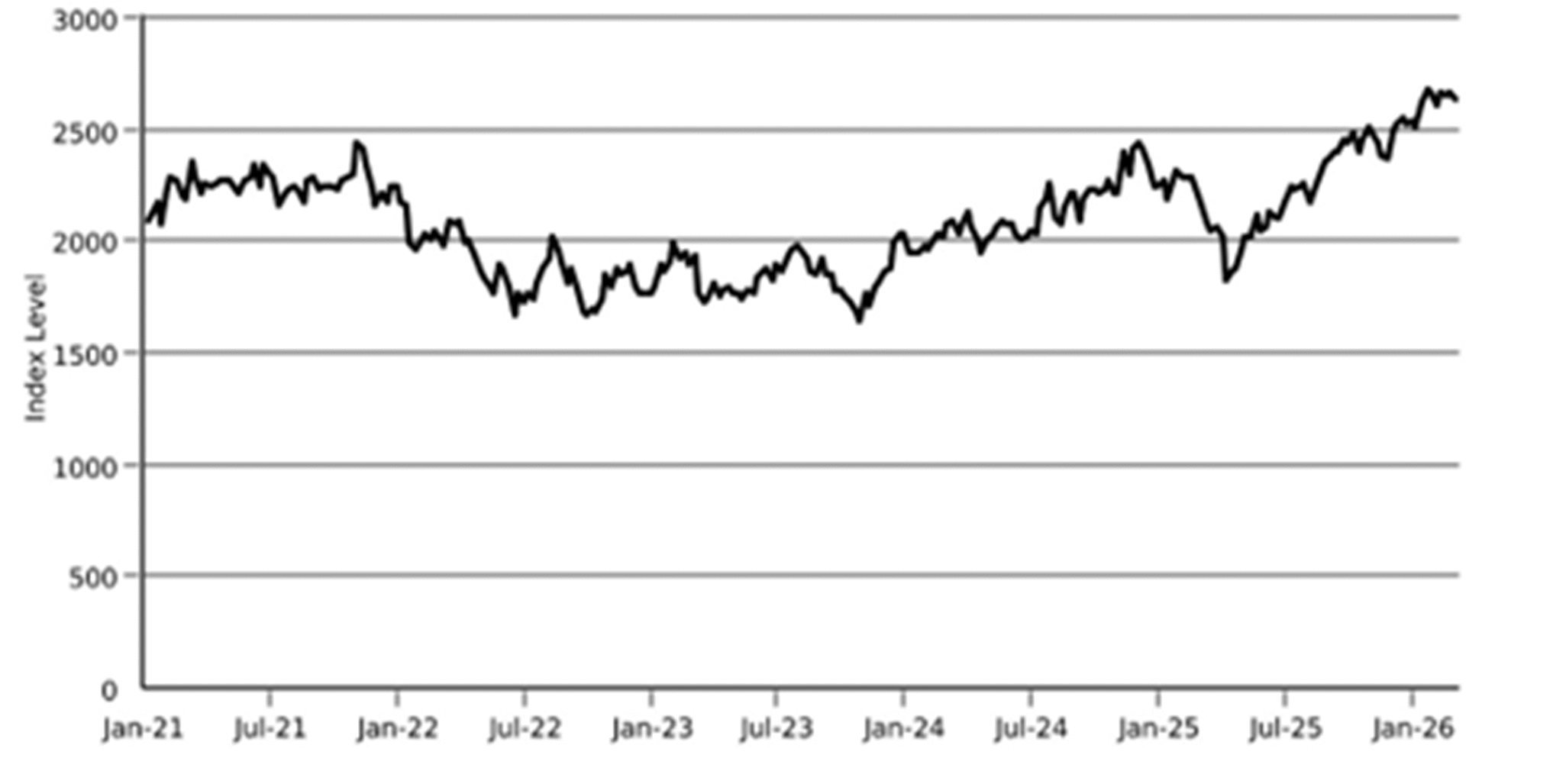 The following graphs set forth the historical performance of each Index based on the weekly historical closing levels from January 8, 2021 through February 27, 2026. The closing level of the Russell 2000® Index on February 27, 2026 was 2,632.361. The closing level of the S&P 500® Index on February 27, 2026 was 6,878.88. We obtained the closing levels above and below from the Bloomberg Professional® service (“Bloomberg”), without independent verification.