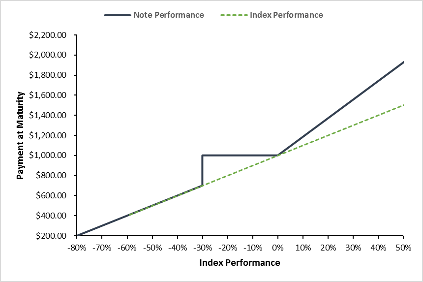 The following table and graph illustrate the hypothetical total return and payment at maturity on the notes linked to a hypothetical Index. The “total return” as used in this pricing supplement is the number, expressed as a percentage, that results from comparing the payment at maturity per $1,000 principal amount note to $1,000. The hypothetical total returns and payments set forth below assume the following: