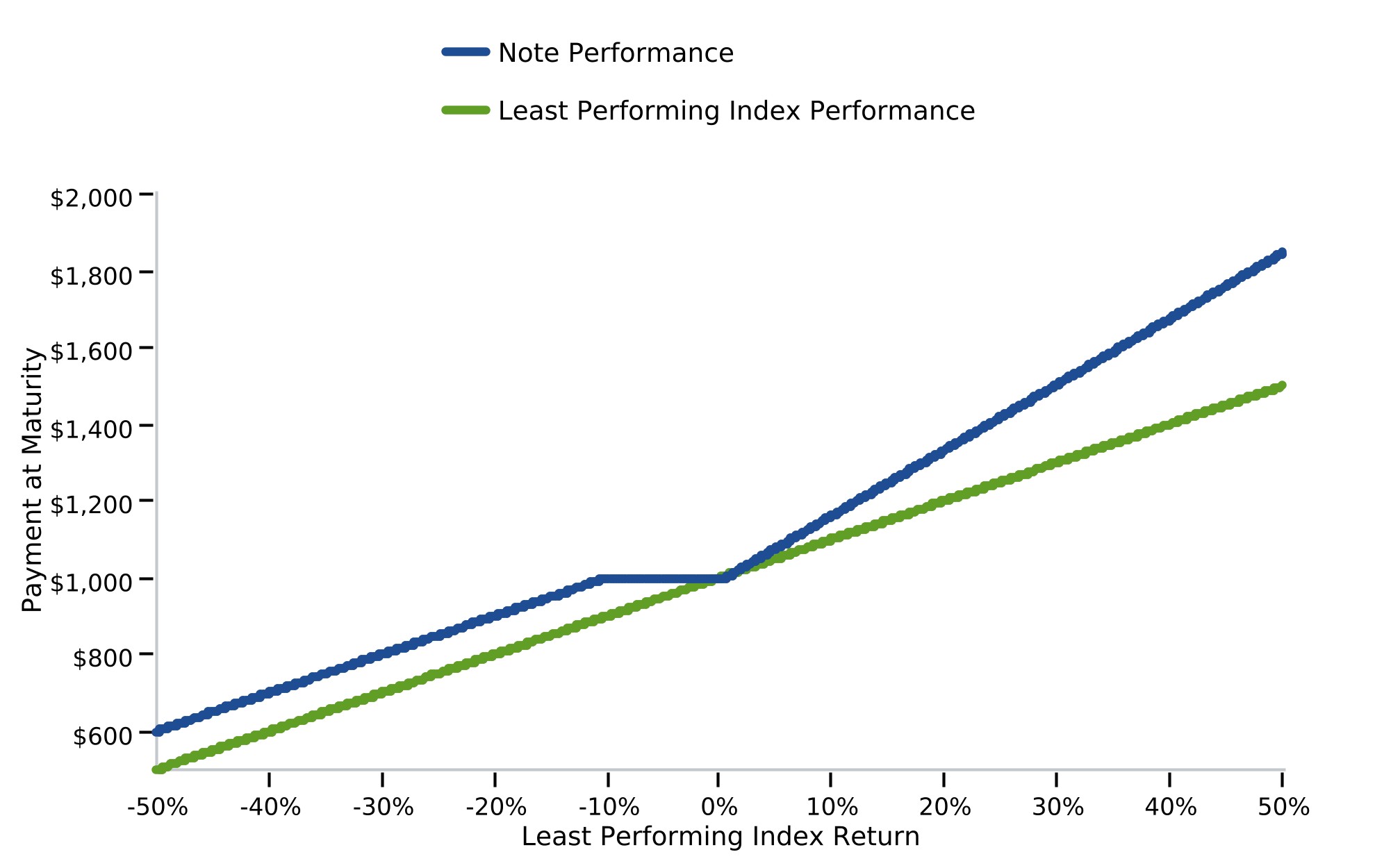 The following graph demonstrates the hypothetical payments at maturity on the notes for a sub-set of Least Performing Index Returns detailed in the table above (-50% to 50%). There can be no assurance that the performance of the Least Performing Index will result in the return of any of your principal amount in excess of $100.00 per $1,000 principal amount note, subject to the credit risks of JPMorgan Financial and JPMorgan Chase & Co.