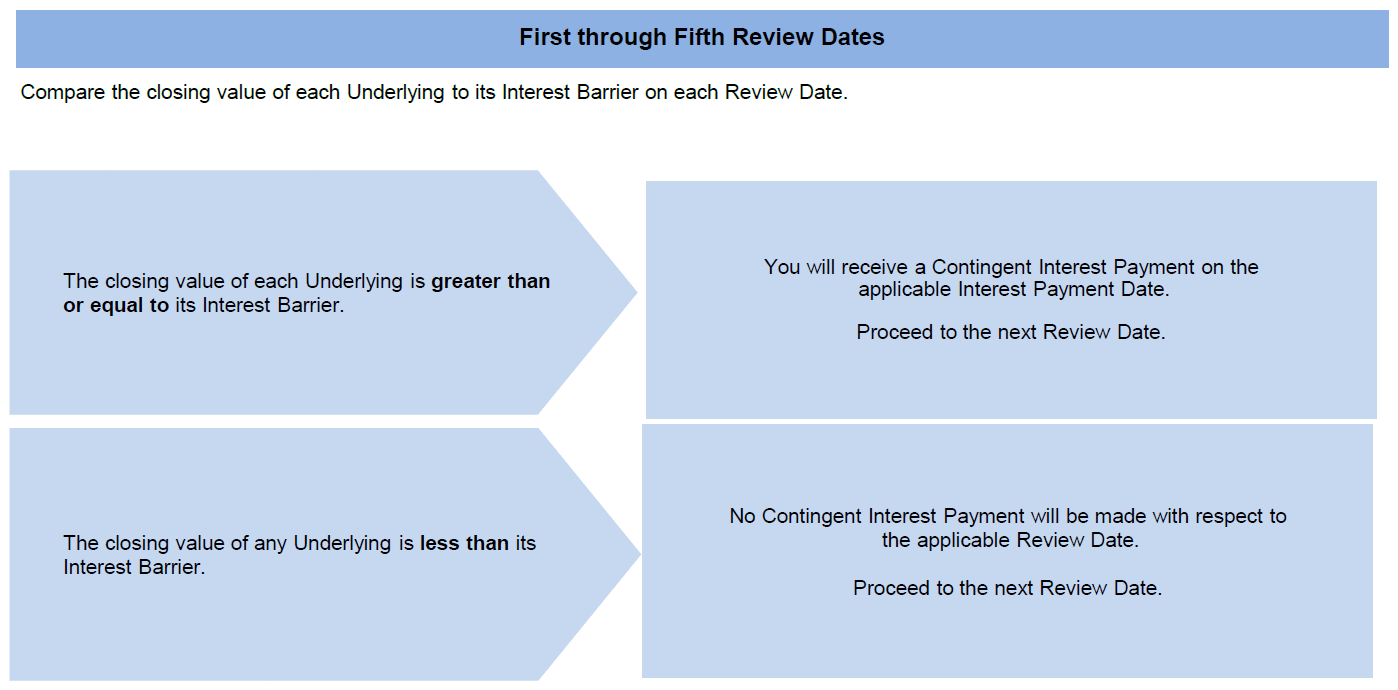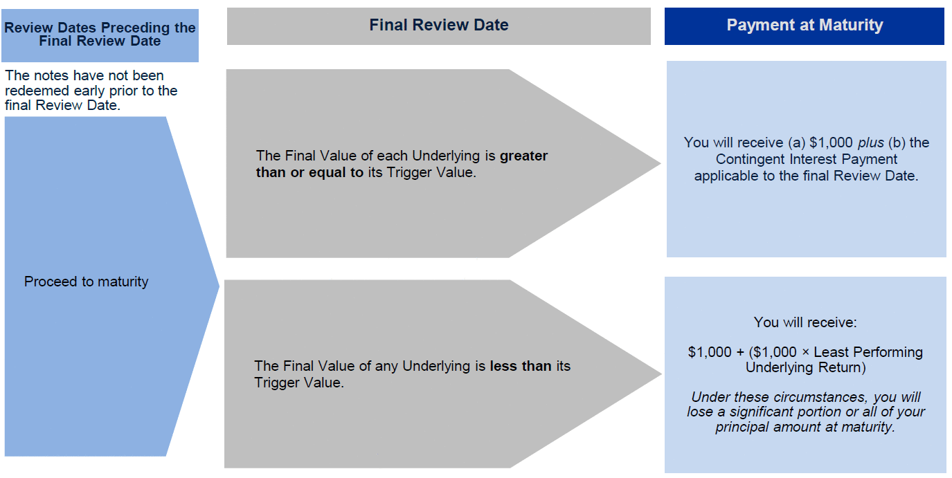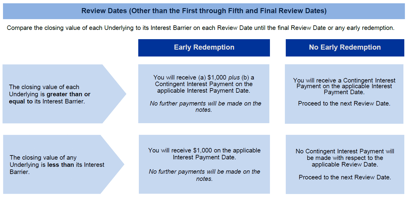 Early Redemption: We, at our election, may redeem the notes early, in whole but not in part, on any of the Interest Payment Dates (other than the first through fifth and final Interest Payment Dates) at a price, for each $1,000 principal amount note, equal to (a) $1,000 plus (b) the Contingent Interest Payment, if any, applicable to the immediately preceding Review Date. If we intend to redeem your notes early, we will deliver notice to The Depository Trust Company, or DTC, at least three business days before the applicable Interest Payment Date on which the notes are redeemed early. Payment at Maturity: If the notes have not been redeemed early and the Final Value of each Underlying is greater than or equal to its Trigger Value, you will receive a cash payment at maturity, for each $1,000 principal amount note, equal to (a) $1,000 plus (b) the Contingent Interest Payment applicable to the final Review Date. If the notes have not been redeemed early and the Final Value of any Underlying is less than its Trigger Value, your payment at maturity per $1,000 principal amount note will be calculated as follows: $1,000 + ($1,000 × Least Performing Underlying Return) If the notes have not been redeemed early and the Final Value of any Underlying is less than its Trigger Value, you will lose more than 30.00% of your principal amount at maturity and could lose all of your principal amount at maturity. Least Performing Underlying: The Underlying with the Least Performing Underlying Return Least Performing Underlying Return: The lowest of the Underlying Returns of the Underlyings Underlying Return: With respect to each Underlying, (Final Value – Initial Value) Initial Value: With respect to each Underlying, the closing value of that Underlying on the Pricing Date Final Value: With respect to each Underlying, the closing value of that Underlying on the final Review Date Share Adjustment Factor: The Share Adjustment Factor is referenced in determining the closing value of the Fund and is set equal to 1.0 on the Pricing Date. The Share Adjustment Factor is subject to adjustment upon the occurrence of certain events affecting the Fund. See “The Underlyings — Funds — Anti-Dilution Adjustments” in the accompanying product supplement for further information. |