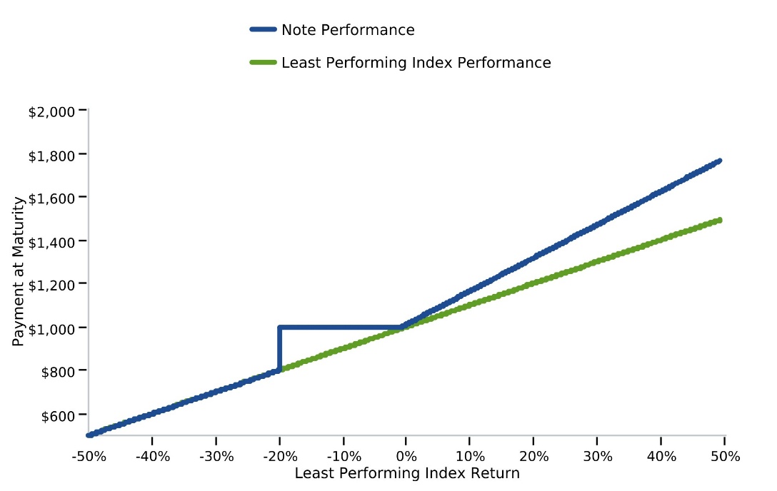 If the Final Value of one or more Indices is equal to or is less than its Initial Value but the Final Value of each Index is greater than or equal to its Barrier Amount of 80.00% of its Initial Value, investors will receive at maturity the principal amount of their notes.