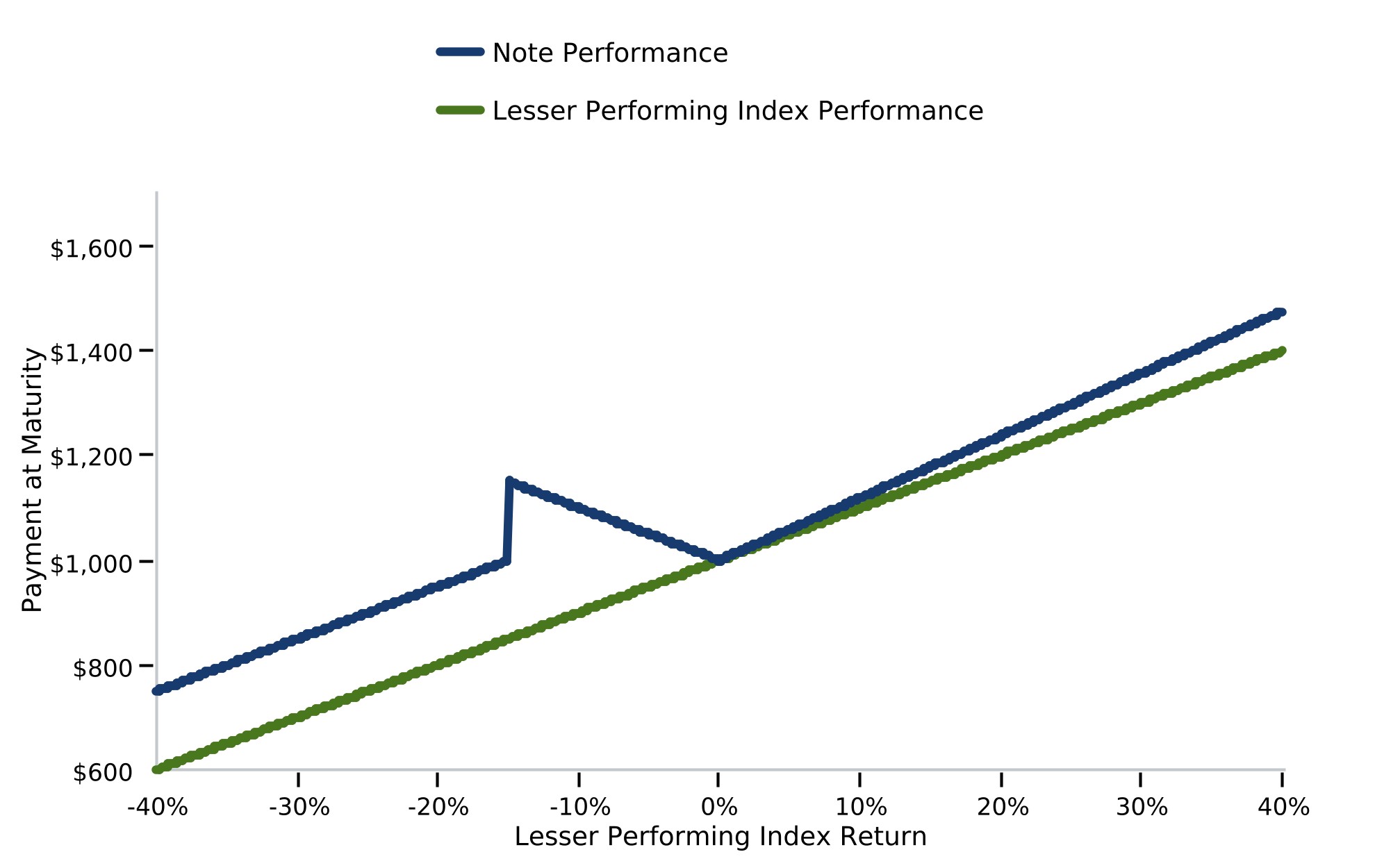 If (i) the Final Value of one Index is greater than its Initial Value and the Final Value of the other Index is equal to its Initial Value or is less than its Initial Value by up to the Buffer Amount of 15.00% or (ii) the Final Value of each Index is equal to its Initial Value or is less than its Initial Value by up to the Buffer Amount of 15.00%, investors will receive at maturity the $1,000 principal amount plus a return equal to the Absolute Index Return of the Lesser Performing Index.
