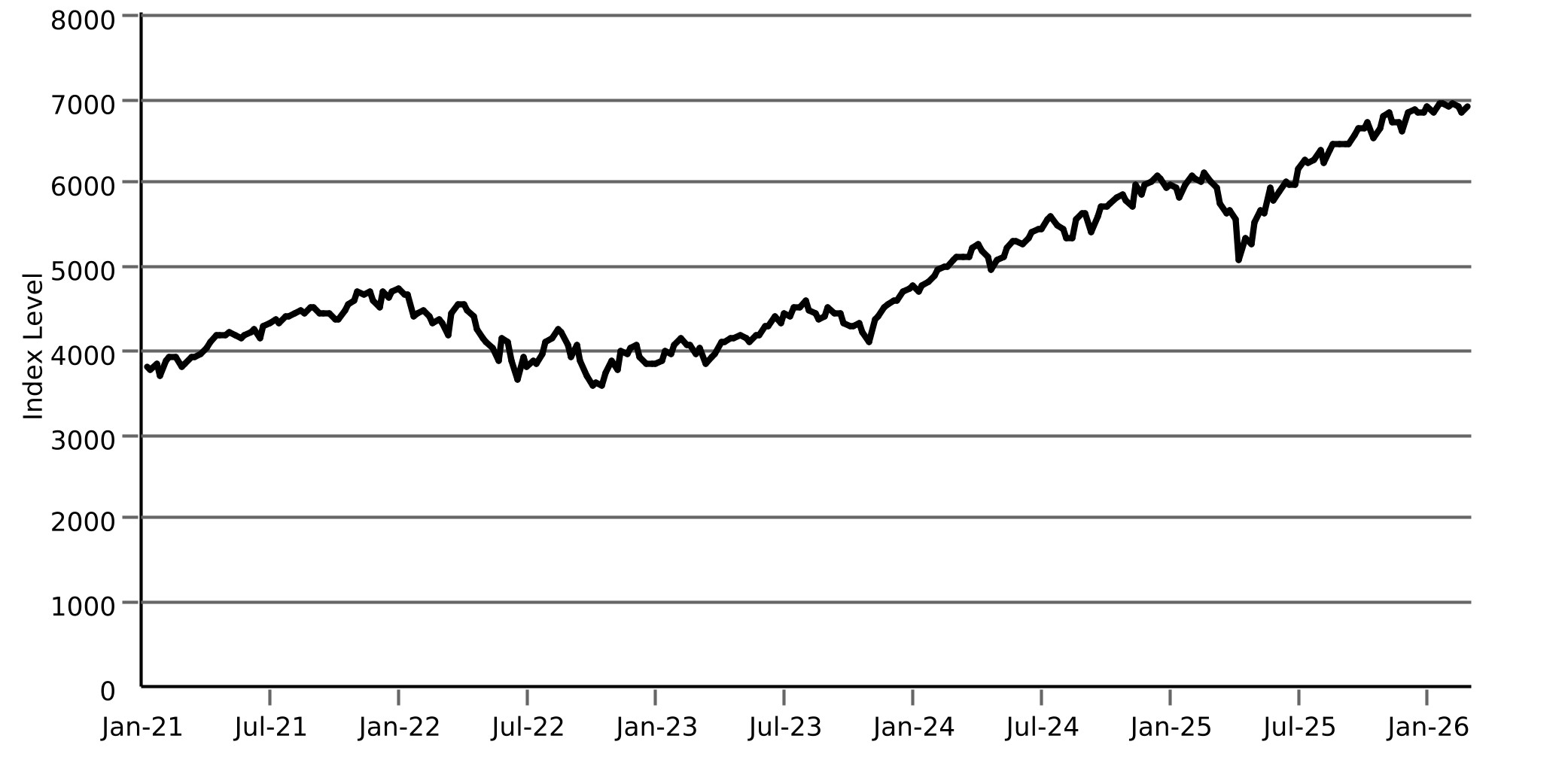 The following graphs set forth the historical performance of each Index based on the weekly historical closing levels from January 8, 2021 through February 20, 2026. The closing level of the Russell 2000® Index on February 25, 2026 was 2,663.329. The closing level of the S&P 500® Index on February 25, 2026 was 6,946.13. We obtained the closing levels above and below from the Bloomberg Professional® service (“Bloomberg”), without independent verification.