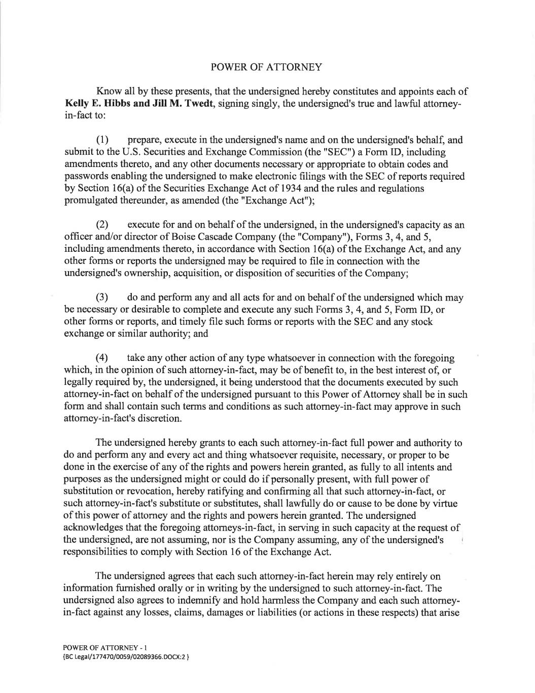 POWER OF ATTORNEY Know all by these presents, that the undersigned hereby constitutes and appoints each of Kelly E. Hibbs and Jill M. Twedt, signing singly, the undersigned's true and lawful attorney- in-fact to: (1) prepare, execute in the undersigned's name and on the undersigned's behalf, and submit to the U.S. Securities and Exchange Commission (the "SEC") a Form ID, including amendments thereto, and any other documents necessary or appropriate to obtain codes and passwords enabling the undersigned to make electronic filings with the SEC of reports required by Section 16(a) of the Securities Exchange Act of 1934 and the rules and regulations promulgated thereunder, as amended (the "Exchange Act"); (2) execute for and on behalf of the undersigned, in the undersigned's capacity as an officer and/or director of Boise Cascade Company (the "Company"), Forms 3, 4, and 5, including amendments thereto, in accordance with Section 16(a) of the Exchange Act, and any other forms or reports the undersigned may be required to file in connection with the undersigned's ownership, acquisition, or disposition of securities of the Company; (3) do and perform any and all acts for and on behalf of the undersigned which may be necessary or desirable to complete and execute any such Forms 3, 4, and 5, Form ID, or other forms or reports, and timely file such forms or reports with the SEC and any stock exchange or similar authority; and (4) take any other action of any type whatsoever in connection with the foregoing which, in the opinion of such attorney-in-fact, may be of benefit to, in the best interest of, or legally required by, the undersigned, it being understood that the documents executed by such attorney-in-fact on behalf of the undersigned pursuant to this Power of Attorney shall be in such form and shall contain such terms and conditions as such attorney-in-fact may approve in such attorney-in-fact's discretion. The undersigned hereby grants to each such attorney-in-fact full power and authority to do and perform any and every act and thing whatsoever requisite, necessary, or proper to be done in the exercise of any of the rights and powers herein granted, as fully to all intents and purposes as the undersigned might or could do if personally present, with full power of substitution or revocation, hereby ratifying and confirming all that such attorney-in-fact, or such attorney-in-fact's substitute or substitutes, shall lawfully do or cause to be done by virtue of this power of attorney and the rights and powers herein granted. The undersigned acknowledges that the foregoing attorneys-in-fact, in serving in such capacity at the request of the undersigned, are not assuming, nor is the Company assuming, any of the undersigned's responsibilities to comply with Section 16 of the Exchange Act. The undersigned agrees that each such attorney-in-fact herein may rely entirely on information furnished orally or in writing by the undersigned to such attorney-in-fact. The undersigned also agrees to indemnify and hold harmless the Company and each such attorney- in-fact against any losses, claims, damages or liabilities (or actions in these respects) that arise POWER OF ATTORNEY - 1 {BC Legal/177470/0059/02089366.DOCX:2 }