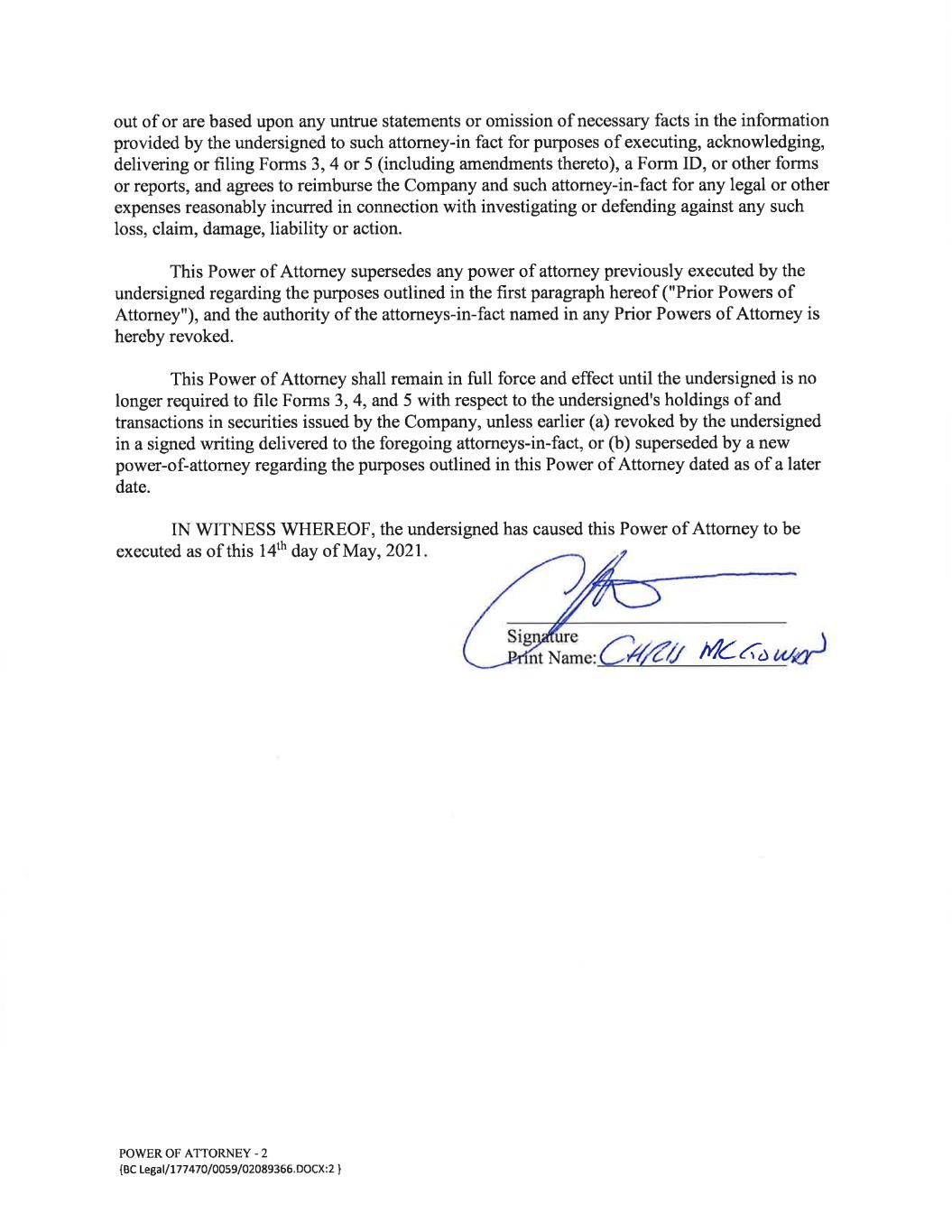 out of or are based upon any untrue statements or omission of necessary facts in the information provided by the undersigned to such attorney-in fact for purposes of executing, acknowledging, delivering or filing Forms 3, 4 or 5 (including amendments thereto), a Form ID, or other forms or reports, and agrees to reimburse the Company and such attorney-in-fact for any legal or other expenses reasonably incurred in connection with investigating or defending against any such loss, claim, damage, liability or action. This Power of Attorney supersedes any power of attorney previously executed by the undersigned regarding the purposes outlined in the first paragraph hereof ("Prior Powers of Attorney"), and the authority of the attorneys-in-fact named in any Prior Powers of Attorney is hereby revoked. This Power of Attorney shall remain in full force and effect until the undersigned is no longer required to file Forms 3, 4, and 5 with respect to the undersigned's holdings of and transactions in securities issued by the Company, unless earlier (a) revoked by the undersigned in a signed writing delivered to the foregoing attorneys-in-fact, or (b) superseded by a new power-of-attorney regarding the purposes outlined in this Power of Attorney dated as of a later date. IN WITNESS WHEREOPF, the undersigned has caused this Power of Attorney to be executed as of this 14" day of May, 2021. ure a Name: Cr AEM MER. B) ier POWER OF ATTORNEY - 2 {BC Legal/177470/0059/02089366.DOCx:2 }
