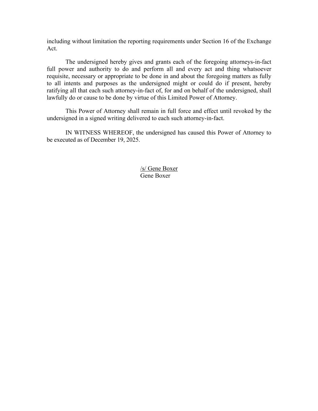 including without limitation the reporting requirements under Section 16 of the Exchange Act. The undersigned hereby gives and grants each of the foregoing attorneys-in-fact full power and authority to do and perform all and every act and thing whatsoever requisite, necessary or appropriate to be done in and about the foregoing matters as fully to all intents and purposes as the undersigned might or could do if present, hereby ratifying all that each such attorney-in-fact of, for and on behalf of the undersigned, shall lawfully do or cause to be done by virtue of this Limited Power of Attorney. This Power of Attorney shall remain in full force and effect until revoked by the undersigned in a signed writing delivered to each such attorney-in-fact. IN WITNESS WHEREOF, the undersigned has caused this Power of Attorney to be executed as of December 19, 2025. /s/ Gene Boxer Gene Boxer