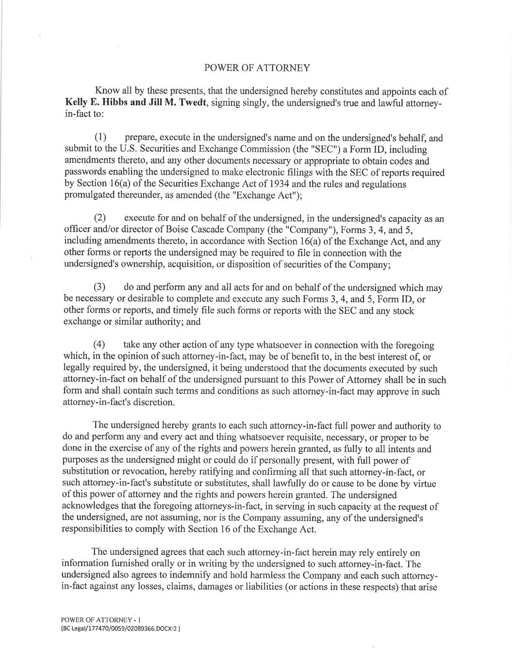 POWER OF ATTORNEY Know all by these presents, that the undersigned hereby constitutes and appoints each of Kelly E. Hibbs and Jill M. Twedt, signing singly, the undersigned's true and lawful attorney- in-fact to: (1) prepare, execute in the undersigned's name and on the undersigned's behalf, and submit to the U.S. Securities and Exchange Commission (the "SEC") a Form ID, including amendments thereto, and any other documents necessary or appropriate to obtain codes and passwords enabling the undersigned to make electronic filings with the SEC of reports required by Section 16(a) of the Securities Exchange Act of 1934 and the rules and regulations promulgated thereunder, as amended (the "Exchange Act"); (2) execute for and on behalf of the undersigned, in the undersigned's capacity as an officer and/or director of Boise Cascade Company (the "Company"), Forms 3, 4, and 5, including amendments thereto, in accordance with Section 16(a) of the Exchange Act, and any other forms or reports the undersigned may be required to file in connection with the undersigned's ownership, acquisition, or disposition of securities of the Company; (3) do and perform any and all acts for and on behalf of the undersigned which may be necessary or desirable to complete and execute any such Forms 3, 4, and 5, Form ID, or other forms or reports, and timely file such forms or reports with the SEC and any stock exchange or similar authority; and (4) take any other action of any type whatsoever in connection with the foregoing which, in the opinion of such attorney-in-fact, may be of benefit to, in the best interest of, or legally required by, the undersigned, it being understood that the documents executed by such attorney-in-fact on behalf of the undersigned pursuant to this Power of Attorney shall be in such form and shall contain such terms and conditions as such attorney-in-fact may approve in such attorney-in-fact's discretion. The undersigned hereby grants to each such attorney-in-fact full power and authority to do and perform any and every act and thing whatsoever requisite, necessary, or proper to be done in the exercise of any of the rights and powers herein granted, as fully to all intents and purposes as the undersigned might or could do if personally present, with full power of substitution or revocation, hereby ratifying and confirming all that such attorney-in-fact, or such attorney-in-fact's substitute or substitutes, shall lawfully do or cause to be done by virtue of this power of attorney and the rights and powers herein granted. The undersigned acknowledges that the foregoing attorneys-in-fact, in serving in such capacity at the request of the undersigned, are not assuming, nor is the Company assuming, any of the undersigned's responsibilities to comply with Section 16 of the Exchange Act. The undersigned agrees that each such attorney-in-fact herein may rely entirely on information furnished orally or in writing by the undersigned to such attorney-in-fact. The undersigned also agrees to indemnify and hold harmless the Company and each such attorney- in-fact against any losses, claims, damages or liabilities (or actions in these respects) that arise POWER OF ATTORNEY - 1 {BC Legal/177470/0059/02089366.DOCX:2 }