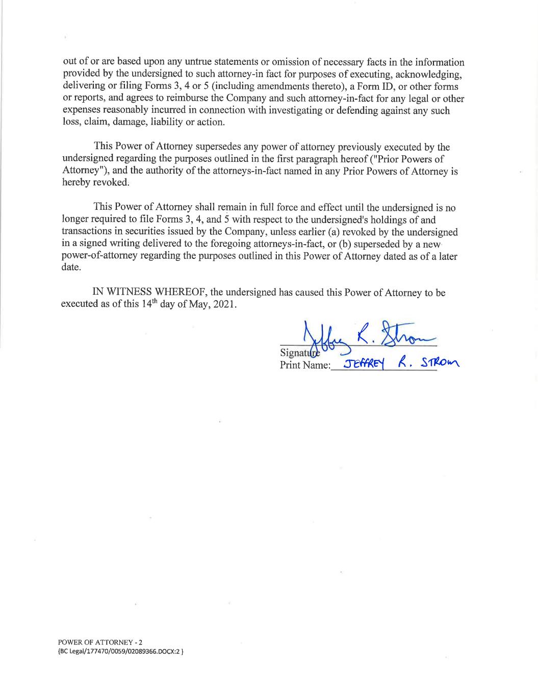out of or are based upon any untrue statements or omission of necessary facts in the information provided by the undersigned to such attorney-in fact for purposes of executing, acknowledging, delivering or filing Forms 3, 4 or 5 (including amendments thereto), a Form ID, or other forms or reports, and agrees to reimburse the Company and such attorney-in-fact for any legal or other expenses reasonably incurred in connection with investigating or defending against any such loss, claim, damage, liability or action. This Power of Attorney supersedes any power of attorney previously executed by the undersigned regarding the purposes outlined in the first paragraph hereof ("Prior Powers of Attorney"), and the authority of the attorneys-in-fact named in any Prior Powers of Attorney is hereby revoked: This Power of Attomey shall remain in full force and effect until the undersigned is no longer required to file Forms 3, 4, and 5 with respect to the undersigned's holdings of and transactions in securities issued by the Company, unless earlier (a) revoked by the undersigned in a signed writing delivered to the foregoing attorneys-in-fact, or (b) superseded by a new power-of-attorney regarding the purposes outlined in this Power of Attorney dated as of a later date. IN WITNESS WHEREOF, the undersigned has caused this Power of Attorney to be executed as of this 14"" day of May, 2021. Signatuy: Y~ Print Name:__ SJ EfFREY A, Sthom POWER OF ATTORNEY - 2 {BC Legal/177470/0059/02089366.DOCX:2 }
