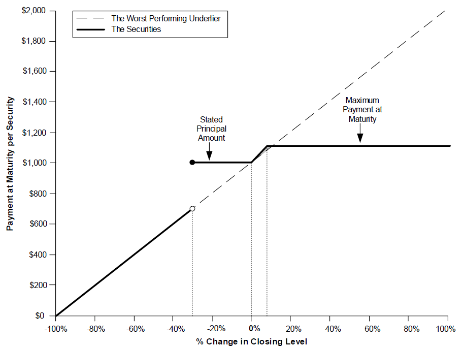 oIf the worst performing underlier appreciates 100%, investors will receive only the maximum payment at maturity of $1,100 per security, or 110% of the stated principal amount.