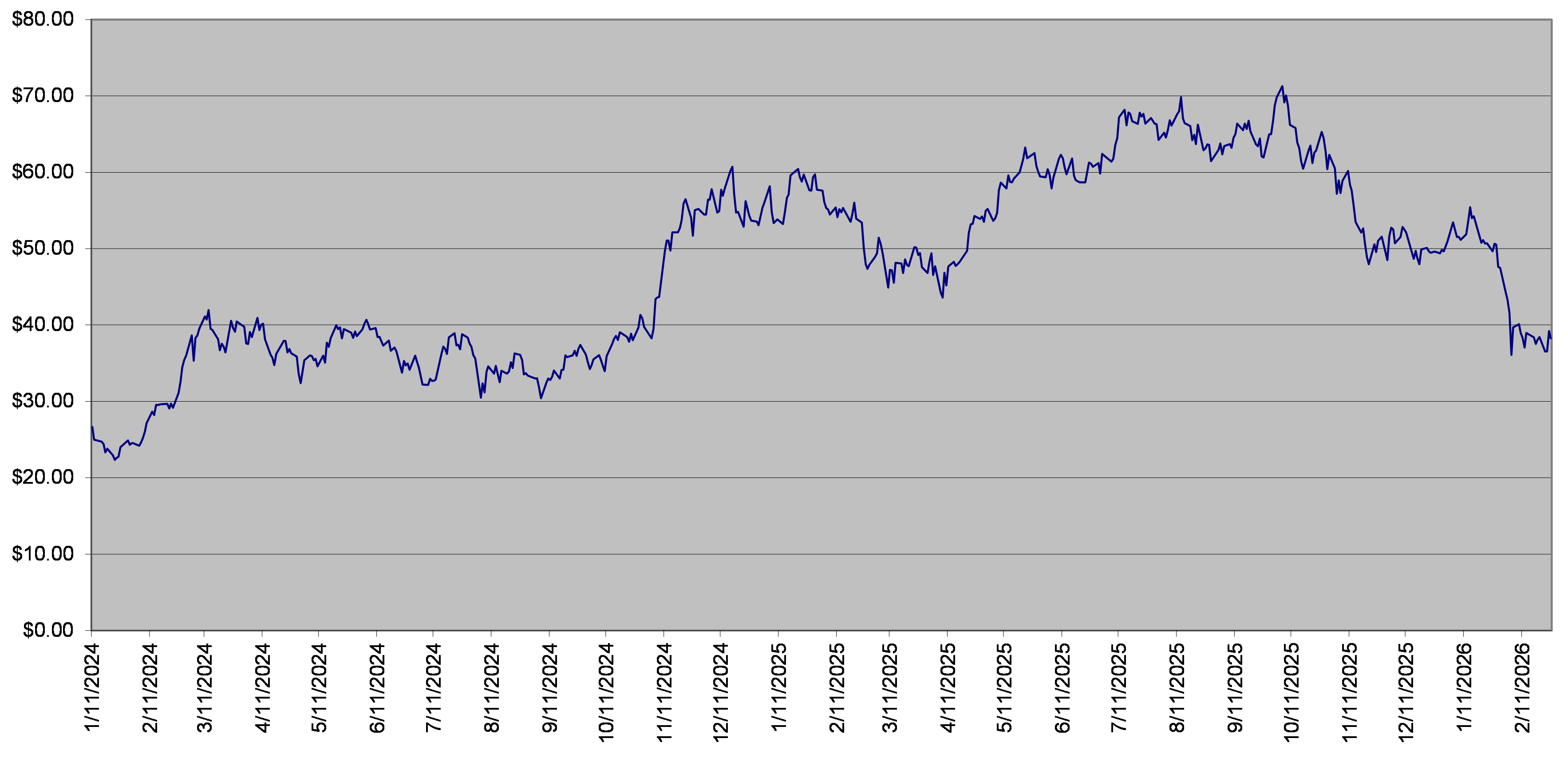 The closing level of the underlier on February 26, 2026 was $38.26. The following graph sets forth the daily closing levels of the underlier for the period noted below. We obtained the historical information presented in this document from Bloomberg Financial Markets, without independent verification. The underlier has at times experienced periods of high volatility. You should not take the historical closing levels of the underlier as an indication of its future performance, and no assurance can be given as to the closing level of the underlier at any time.