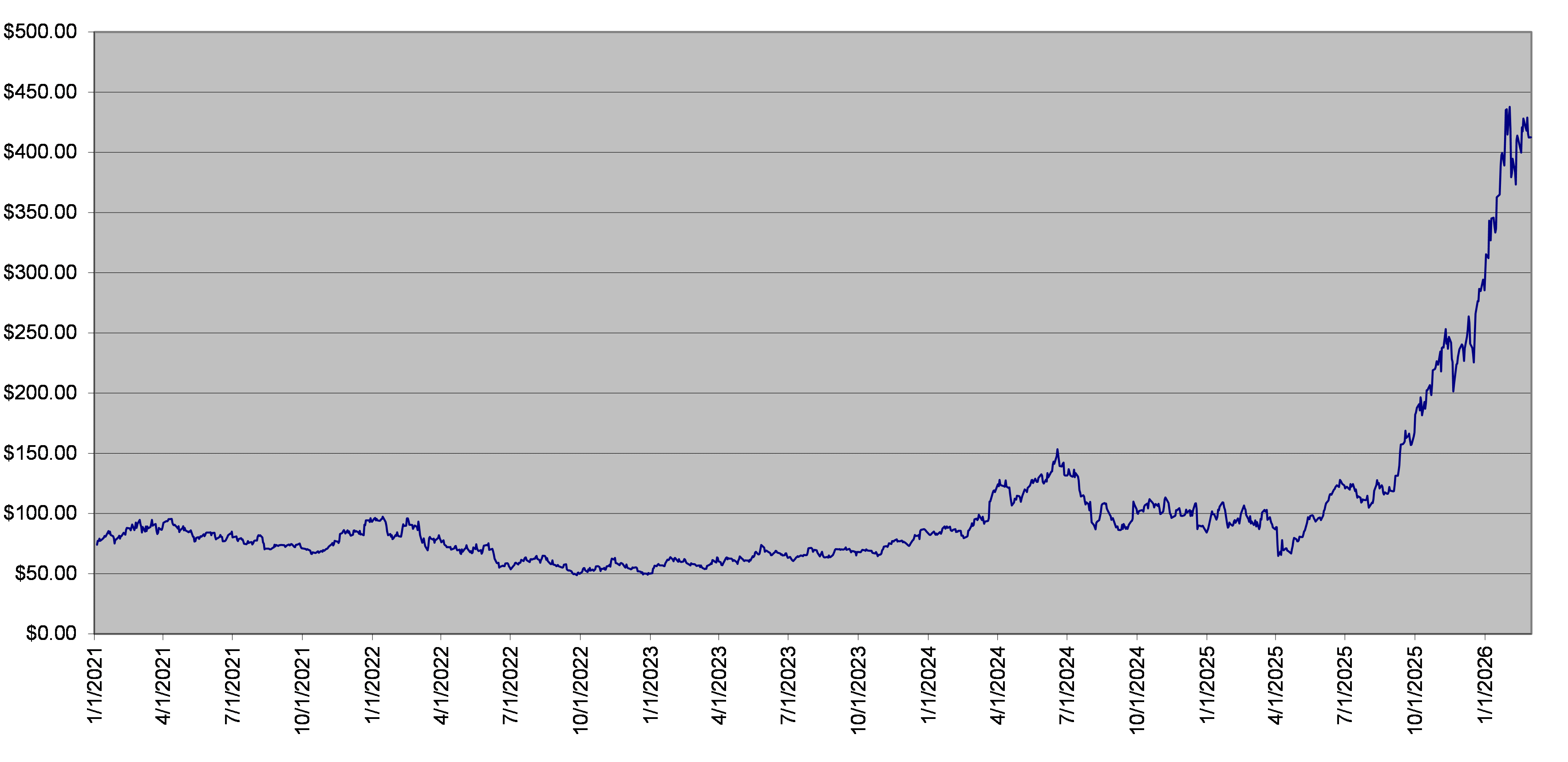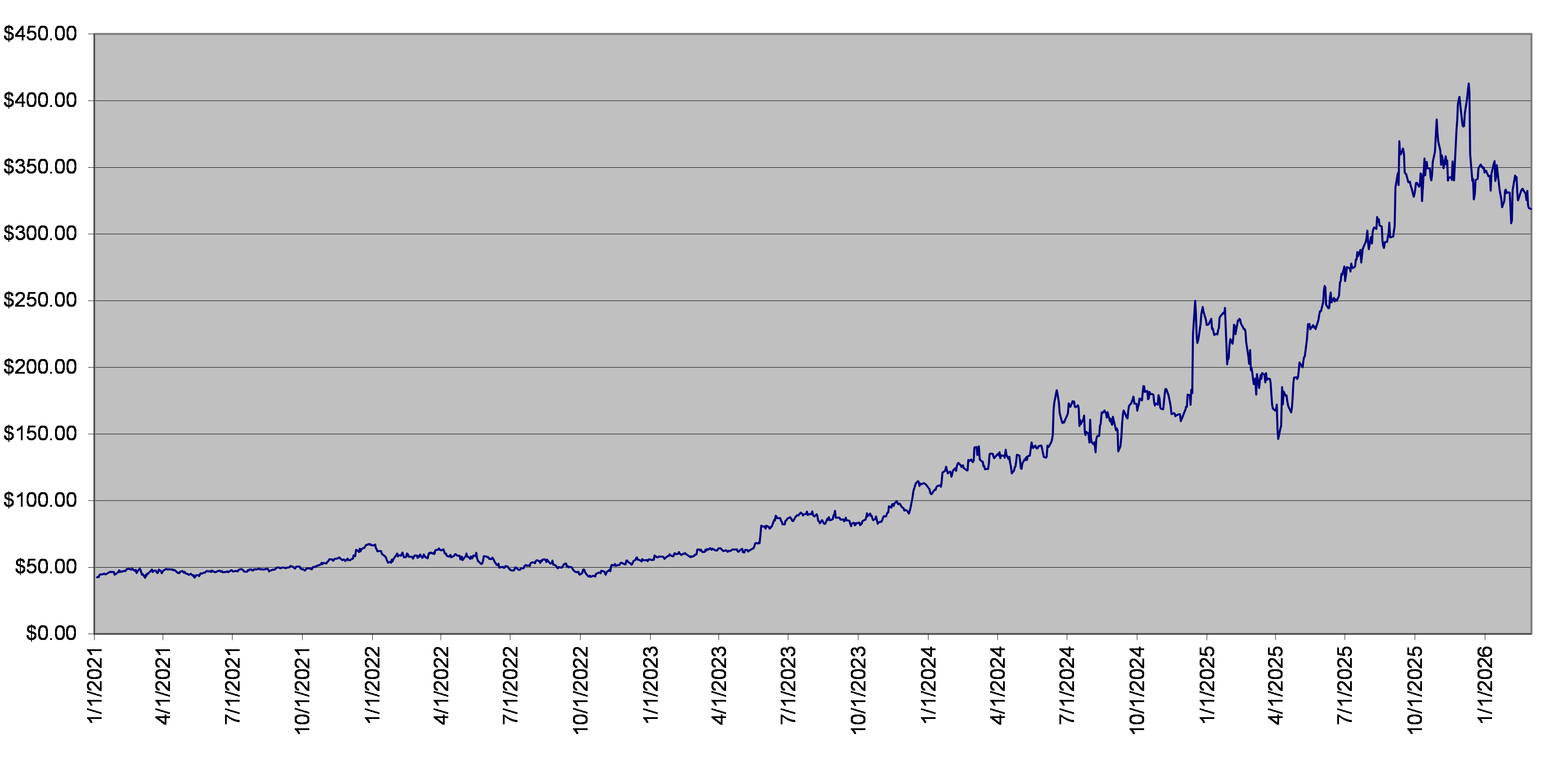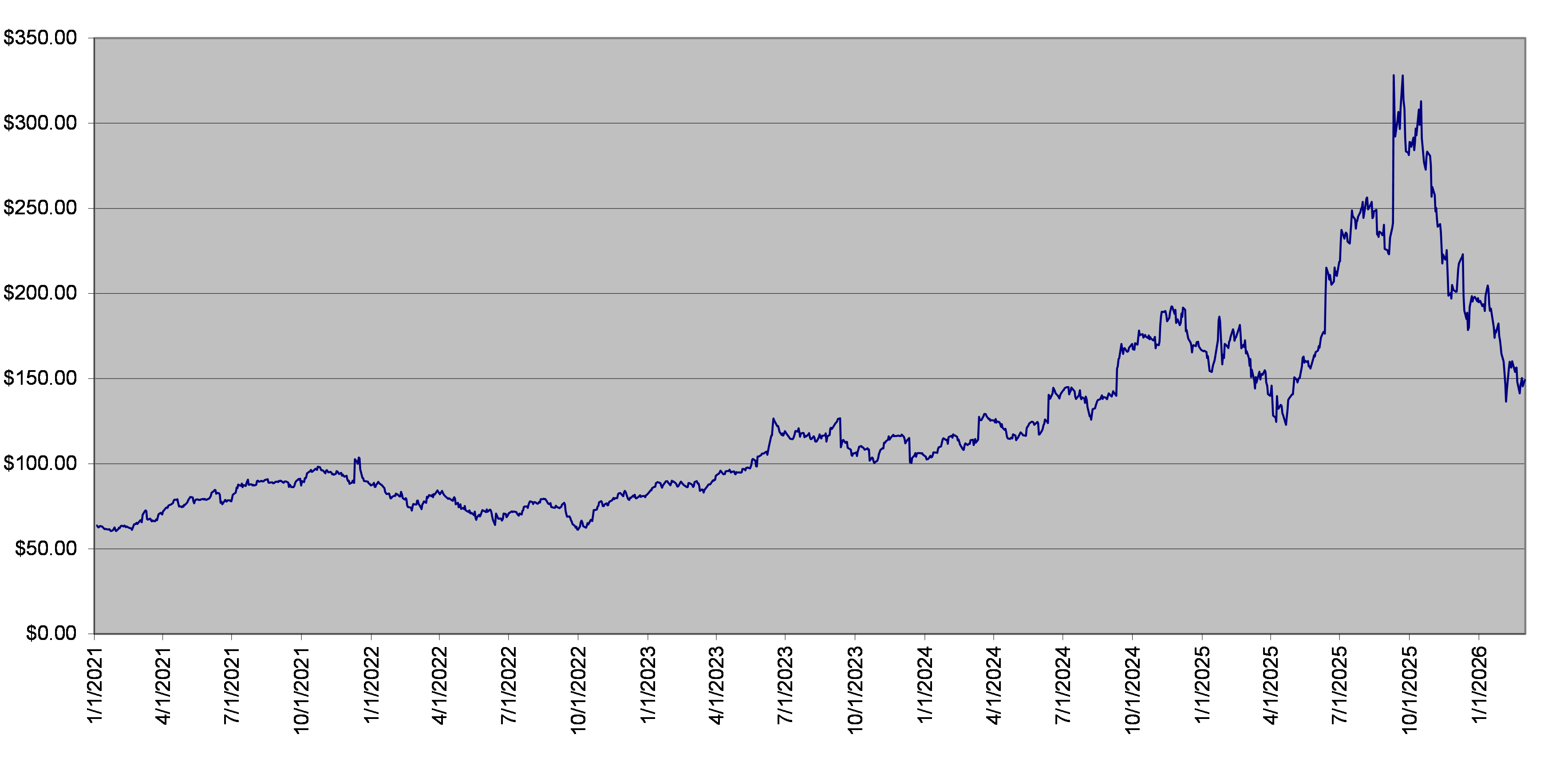 MU Stock Daily Closing Levels January 1, 2021 to March 2, 2026 |