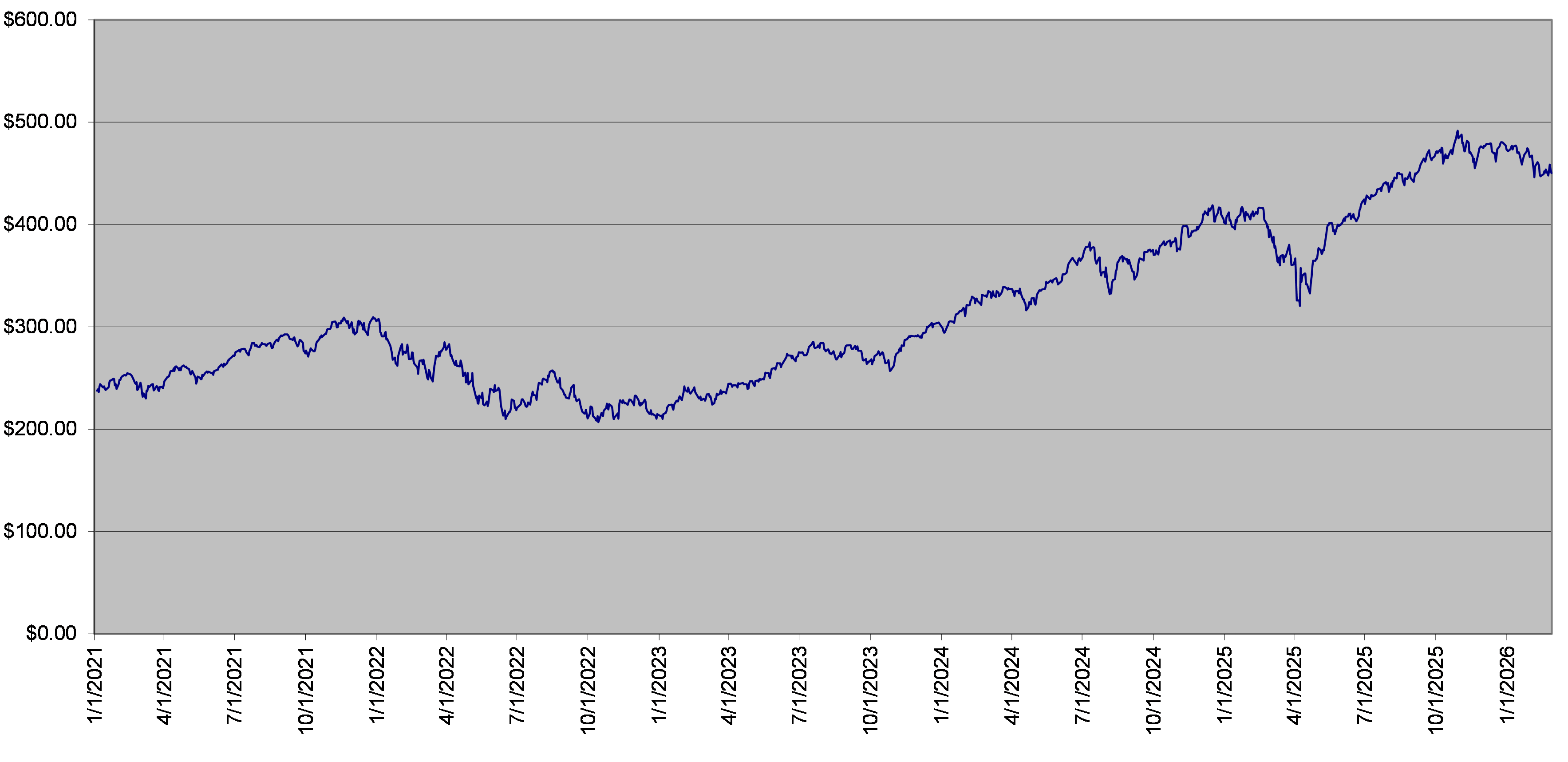 The closing level of the underlier on February 27, 2026 was $450.19. The following graph sets forth the daily closing levels of the underlier for the period noted below. We obtained the historical information presented in this document from Bloomberg Financial Markets, without independent verification. The underlier has at times experienced periods of high volatility. You should not take the historical closing levels of the underlier as an indication of its future performance, and no assurance can be given as to the closing level of the underlier at any time.