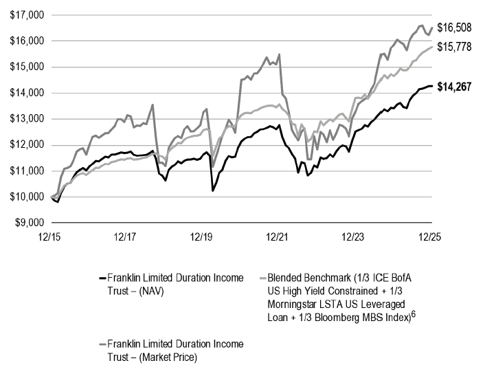 For the 12 months under review, the Fund posted cumulative total returns of +6.31% based on net asset value and +4.11% based on market price. The Fund’s benchmark, the blended 1/3 ICE BofA US High Yield Constrained Index + 1/3 Morningstar® LSTA® US Leveraged Loan IndexSM + 1/3 Bloomberg MBS Index, posted a +7.68% cumulative total return.1 Individually, the ICE BofA US High Yield Constrained Index, which measures the performance of USD-denominated, noninvestment grade, fixed rate and taxable corporate bonds, posted a +8.50% cumulative total return.2 The Morningstar® LSTA® US Leveraged Loan IndexSM, which is designed to reflect the performance of the largest facilities in the leveraged loan market, posted a +5.90% cumulative total return.1 The Bloomberg MBS Index, which tracks the performance of fixed-rate agency mortgage-backed pass-through securities guaranteed by Ginnie Mae (GNMA), Fannie Mae (FNMA) and Freddie Mac (FHLMC), posted a 8.58% cumulative total return.2 Over the period, net asset value decreased from $6.94 per share on December 31, 2024, to $6.62 at period-end, and the market price decreased from $6.63 to $6.15 at period-end. You can find the Fund’s long-term performance data in the Performance Summary on page 5.