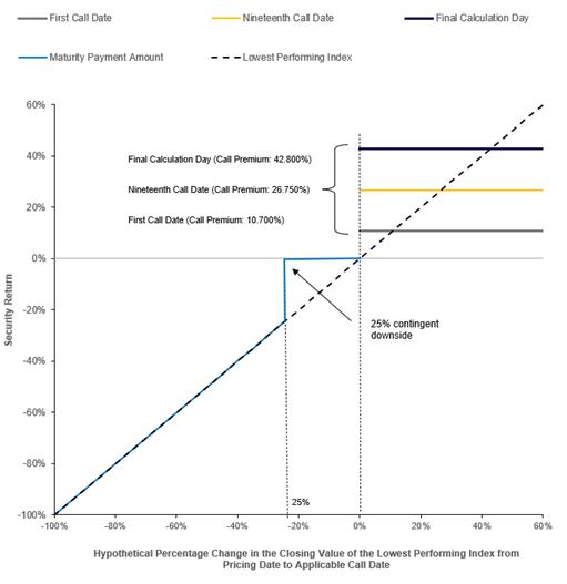 Because the hypothetical closing level of the lowest performing Index on each call date prior to the last call date (which is the final calculation day) is less than its hypothetical starting level, the securities are not automatically called prior to the final calculation day. Because the hypothetical closing level of the lowest performing Index on the final calculation day is greater than or equal to its starting level, the securities are automatically called on the final calculation day and you will receive on the related call settlement date (which is the stated maturity date) the principal amount of your securities plus a call premium of 42.800% of the principal amount.
