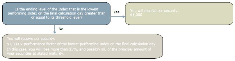 On the stated maturity date, you would receive $450.00 per security. This example illustrates that you will be fully exposed to a decrease in the lowest performing Index if the ending level of the lowest performing Index on the final calculation day is less than its threshold level, even if the ending levels of the other Indices have appreciated or have not declined below their respective threshold levels.