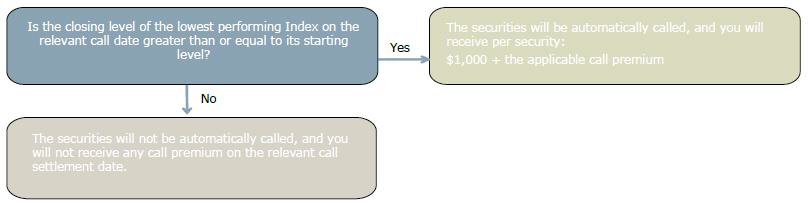 If the closing level of the lowest performing Index on any call date is greater than or equal to its starting level, the securities will be automatically called, and on the related call settlement date you will be entitled to receive a cash payment per security in U.S. dollars equal to the principal amount plus the call premium applicable to the relevant call date. Any positive return on the securities will be limited to the applicable call premium, even if the closing level of the lowest performing Index on the applicable call date significantly exceeds its starting level. You will not participate in any appreciation of any Index. If the securities are automatically called, they will cease to be outstanding on the related call settlement date and you will have no further rights under the securities after that call settlement date. You will not receive any notice from us if the securities are automatically called. |
